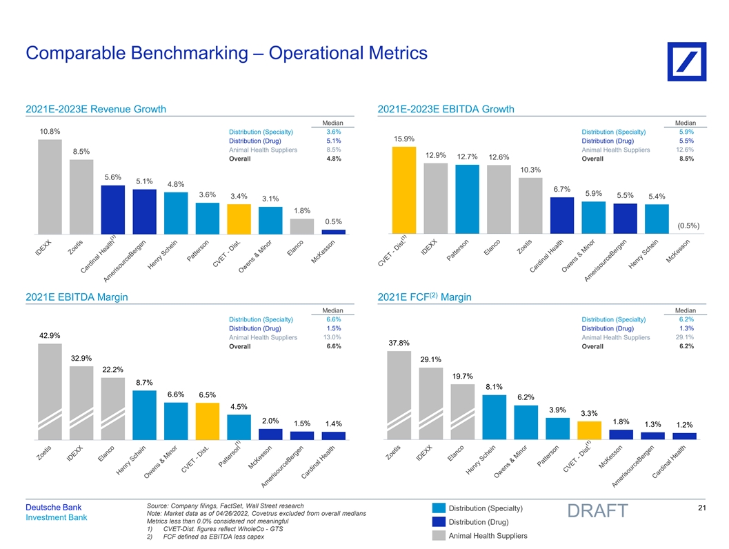 Perspectives on Public Comparables for CVET Distribution Distribution (Specialty) Distribution (Drug) Animal Health Suppliers ▪ Higher growth and margin specialty ▪ Global supply chain leaders, with a core ▪ Relevant companies that benefit from distributors with leading position across focus on pharmaceutical distribution similar end markets specific end markets ▪ Increasingly diversifying into higher growth ▪ Success of distributors tied to growth of ▪ More supply focused vs. pharmaceutical / margin segments (animal health, home suppliers care, services) ▪ Likely to serve as valuation reference-▪ Margin profile difference given product vs. points for Wall Street analysts and ▪ Relevant reference, however, Rx business distribution mix investors alike vis-à-vis similar value reduces margin profile; recent/near term propositions and business models idiosyncratic impact from opioid issues TEV / EBITDA TEV / EBITDA TEV / EBITDA 2021E 2022E 2023E 2021E 2022E 2023E 2021E 2022E 2023E 13.0x 11.4x 10.3x 10.5x 10.2x 9.8x 26.1x 23.7x 21.4x ’21E – ’23E CAGR 2021E ’21E – ’23E CAGR 2021E ’21E – ’23E CAGR 2021E Revenue EBITDA EBITDA Margin Revenue EBITDA EBITDA Margin Revenue EBITDA EBITDA Margin 3.6% 5.9% 6.6% 5.1% 5.5% 1.5% 8.5% 12.6% 32.9% Note: Market data as of 04/26/2022; excludes multiples <0.0x and > 100.0x; valuation medians exclude Medline Deutsche Bank 20 Source: Company information, FactSet DRAFT Investment Bank Valuation Metrics (Median) Comps 81nidZpGqzkSDMpD