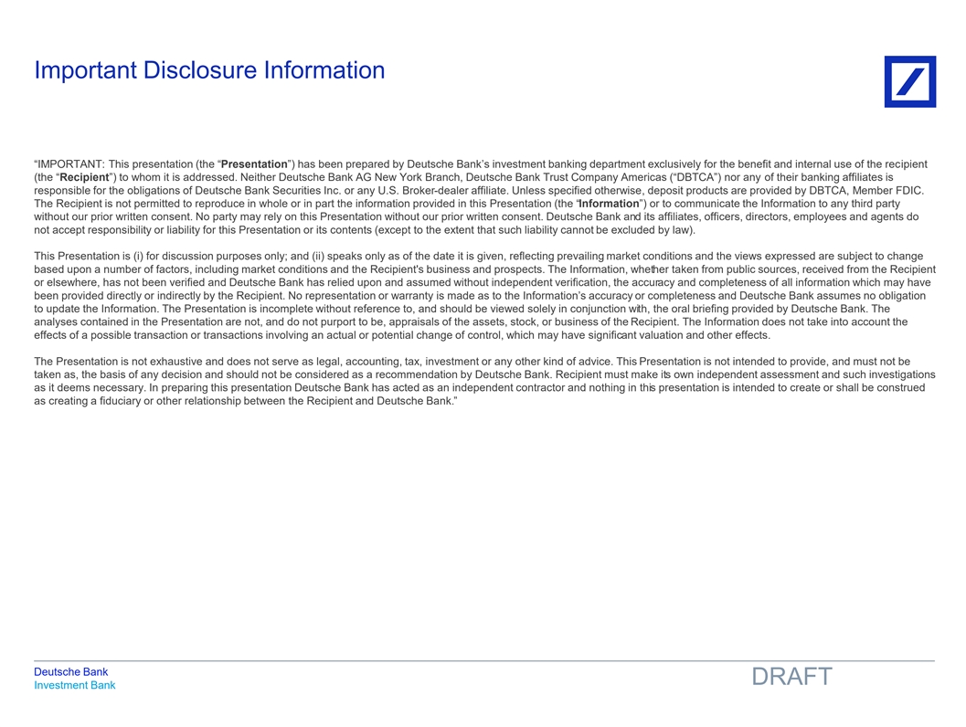 Important Disclosure Information “IMPORTANT: This presentation (the “Presentation”) has been prepared by Deutsche Bank’s investment banking department exclusively for the benefit and internal use of the recipient (the “Recipient”) to whom it is addressed. Neither Deutsche Bank AG New York Branch, Deutsche Bank Trust Company Americas (“DBTCA”) nor any of their banking affiliates is responsible for the obligations of Deutsche Bank Securities Inc. or any U.S. Broker-dealer affiliate. Unless specified otherwise, deposit products are provided by DBTCA, Member FDIC. The Recipient is not permitted to reproduce in whole or in part the information provided in this Presentation (the “Information”) or to communicate the Information to any third party without our prior written consent. No party may rely on this Presentation without our prior written consent. Deutsche Bank and its affiliates, officers, directors, employees and agents do not accept responsibility or liability for this Presentation or its contents (except to the extent that such liability cannot be excluded by law). This Presentation is (i) for discussion purposes only; and (ii) speaks only as of the date it is given, reflecting prevailing market conditions and the views expressed are subject to change based upon a number of factors, including market conditions and the Recipient's business and prospects. The Information, whether taken from public sources, received from the Recipient or elsewhere, has not been verified and Deutsche Bank has relied upon and assumed without independent verification, the accuracy and completeness of all information which may have been provided directly or indirectly by the Recipient. No representation or warranty is made as to the Information’s accuracy or completeness and Deutsche Bank assumes no obligation to update the Information. The Presentation is incomplete without reference to, and should be viewed solely in conjunction with, the oral briefing provided by Deutsche Bank. The analyses contained in the Presentation are not, and do not purport to be, appraisals of the assets, stock, or business of the Recipient. The Information does not take into account the effects of a possible transaction or transactions involving an actual or potential change of control, which may have significant valuation and other effects. The Presentation is not exhaustive and does not serve as legal, accounting, tax, investment or any other kind of advice. This Presentation is not intended to provide, and must not be taken as, the basis of any decision and should not be considered as a recommendation by Deutsche Bank. Recipient must make its own independent assessment and such investigations as it deems necessary. In preparing this presentation Deutsche Bank has acted as an independent contractor and nothing in this presentation is intended to create or shall be construed as creating a fiduciary or other relationship between the Recipient and Deutsche Bank.” Deutsche Bank DRAFT Investment Bank 81nidZpGqzkSDMpD