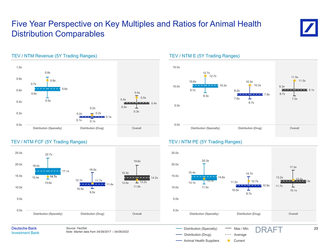 Public Market Benchmarking – Valuation Metrics EV / 2022E Revenue EV / 2022E EBITDA Median Median Distribution (Specialty) 0.6x Distribution (Specialty) 11.4x 0.2x 10.2x Distribution (Drug) Distribution (Drug) 33.3x Animal Health Suppliers 10.3x Animal Health Suppliers 23.7x 11.2x Overall 0.6x Overall 11.4x 10.3x 23.7x 3.7x 1.1x 15.4x 12.3x 11.4x 10.8x 10.2x 0.6x 7.6x 0.5x 7.4x 0.2x 0.2x 0.1x (1) EV / 2022E FCF Price / 2022E Earnings Median Median Distribution (Specialty) 13.1x Distribution (Specialty) 14.5x 39.2x 48.2x 11.7x 13.6x Distribution (Drug) Distribution (Drug) 24.7x Animal Health Suppliers 24.7x Animal Health Suppliers 34.2x 34.2x Overall 13.1x Overall 14.5x 21.0x 17.9x 17.6x 14.5x 14.4x 13.6x 13.4x 13.1x 12.1x 11.7x 13.9x 10.9x 9.0x 8.3x Source: Company filings, FactSet, Wall Street research Deutsche Bank 22 Distribution (Specialty) Note: Market data as of 04/26/2022; CVET excluded from overall medians DRAFT Investment Bank multiples less than 0.0x or greater than 75.0x considered not meaningful Distribution (Drug) 1) FCF defined as EBITDA less capex Animal Health Suppliers 81nidZpGqzkSDMpD