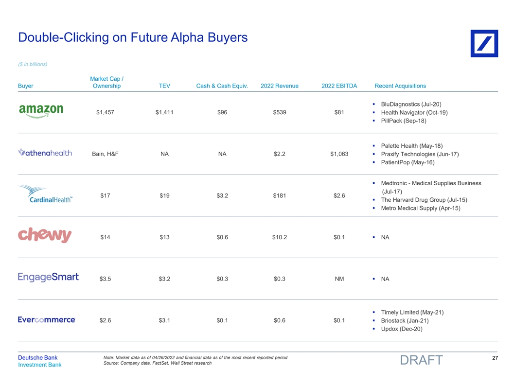 Double-Clicking on Future Alpha Buyers ($ in billions) Market Cap / Buyer Ownership TEV Cash & Cash Equiv. 2022 Revenue 2022 EBITDA Recent Acquisitions ▪ BluDiagnostics (Jul-20) $1,457 $1,411 $96 $539 $81 ▪ Health Navigator (Oct-19) ▪ PillPack (Sep-18) ▪ Palette Health (May-18) Bain, H&F NA NA $2.2 $1,063▪ Praxify Technologies (Jun-17) ▪ PatientPop (May-16) ▪ Medtronic - Medical Supplies Business (Jul-17) $17 $19 $3.2 $181 $2.6 ▪ The Harvard Drug Group (Jul-15) ▪ Metro Medical Supply (Apr-15) $14 $13 $0.6 $10.2 $0.1▪ NA $3.5 $3.2 $0.3 $0.3 NM ▪ NA ▪ Timely Limited (May-21) $2.6 $3.1 $0.1 $0.6 $0.1▪ Briostack (Jan-21) ▪ Updox (Dec-20) Note: Market data as of 04/26/2022 and financial data as of the most recent reported period Deutsche Bank 27 Source: Company data, FactSet, Wall Street research DRAFT Investment Bank 81nidZpGqzkSDMpD