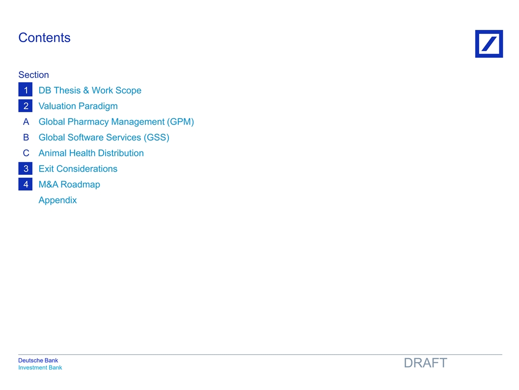 Contents Section 1 DB Thesis & Work Scope 2 Valuation Paradigm A Global Pharmacy Management (GPM) B Global Software Services (GSS) C Animal Health Distribution 3 Exit Considerations 4 M&A Roadmap Appendix Deutsche Bank DRAFT Investment Bank 81nidZpGqzkSDMpD