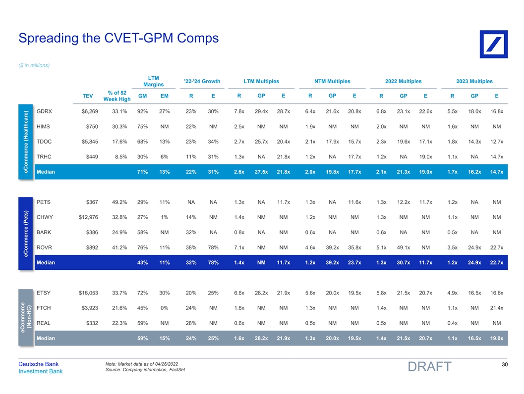 Spreading the CVET-GPM Comps ($ in millions) LTM '22-'24 Growth LTM Multiples NTM Multiples 2022 Multiples 2023 Multiples Margins % of 52 TEV GM EM R E R GP E R GP E R GP E R GP E Week High GDRX $6,269 33.1% 92% 27% 23% 30% 7.8x 29.4x 28.7x 6.4x 21.6x 20.8x 6.8x 23.1x 22.6x 5.5x 18.0x 16.8x HIMS $750 30.3% 75% NM 22% NM 2.5x NM NM 1.9x NM NM 2.0x NM NM 1.6x NM NM TDOC $5,845 17.6% 68% 13% 23% 34% 2.7x 25.7x 20.4x 2.1x 17.9x 15.7x 2.3x 19.6x 17.1x 1.8x 14.3x 12.7x TRHC $449 8.5% 30% 6% 11% 31% 1.3x NA 21.8x 1.2x NA 17.7x 1.2x NA 19.0x 1.1x NA 14.7x Median 71% 13% 22% 31% 2.6x 27.5x 21.8x 2.0x 19.8x 17.7x 2.1x 21.3x 19.0x 1.7x 16.2x 14.7x PETS $367 49.2% 29% 11% NA NA 1.3x NA 11.7x 1.3x NA 11.6x 1.3x 12.2x 11.7x 1.2x NA NM CHWY $12,976 32.8% 27% 1% 14% NM 1.4x NM NM 1.2x NM NM 1.3x NM NM 1.1x NM NM BARK $386 24.9% 58% NM 32% NA 0.8x NA NM 0.6x NA NM 0.6x NA NM 0.5x NA NM ROVR $892 41.2% 76% 11% 38% 78% 7.1x NM NM 4.6x 39.2x 35.8x 5.1x 49.1x NM 3.5x 24.9x 22.7x Median 43% 11% 32% 78% 1.4x NM 11.7x 1.2x 39.2x 23.7x 1.3x 30.7x 11.7x 1.2x 24.9x 22.7x ETSY $16,053 33.7% 72% 30% 20% 25% 6.6x 28.2x 21.9x 5.6x 20.0x 19.5x 5.8x 21.5x 20.7x 4.9x 16.5x 16.6x FTCH $3,923 21.6% 45% 0% 24% NM 1.6x NM NM 1.3x NM NM 1.4x NM NM 1.1x NM 21.4x REAL $332 22.3% 59% NM 28% NM 0.6x NM NM 0.5x NM NM 0.5x NM NM 0.4x NM NM Median 59% 15% 24% 25% 1.6x 28.2x 21.9x 1.3x 20.0x 19.5x 1.4x 21.5x 20.7x 1.1x 16.5x 19.0x Note: Market data as of 04/26/2022 Deutsche Bank 30 Source: Company information, FactSet DRAFT Investment Bank eCommerce eCommerce (Pets) eCommerce (Healthcare) (Non-HC) 81nidZpGqzkSDMpD