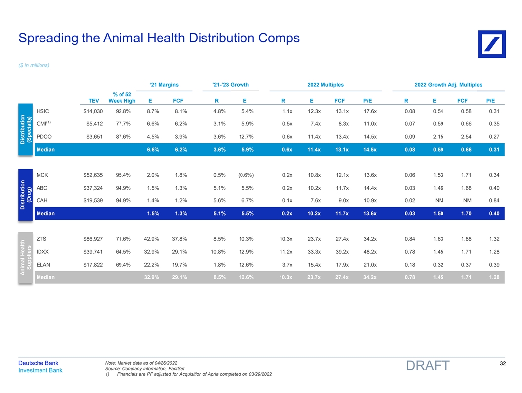 Spreading the Animal Health Distribution Comps ($ in millions) ‘21 Margins '21-’23 Growth 2022 Multiples 2022 Growth Adj. Multiples % of 52 TEV Week High E FCF R E R E FCF P/E R E FCF P/E HSIC $14,030 92.8% 8.7% 8.1% 4.8% 5.4% 1.1x 12.3x 13.1x 17.6x 0.08 0.54 0.58 0.31 (1) OMI $5,412 77.7% 6.6% 6.2% 3.1% 5.9% 0.5x 7.4x 8.3x 11.0x 0.07 0.59 0.66 0.35 PDCO $3,651 87.6% 4.5% 3.9% 3.6% 12.7% 0.6x 11.4x 13.4x 14.5x 0.09 2.15 2.54 0.27 Median 6.6% 6.2% 3.6% 5.9% 0.6x 11.4x 13.1x 14.5x 0.08 0.59 0.66 0.31 MCK $52,635 95.4% 2.0% 1.8% 0.5% (0.6%) 0.2x 10.8x 12.1x 13.6x 0.06 1.53 1.71 0.34 ABC $37,324 94.9% 1.5% 1.3% 5.1% 5.5% 0.2x 10.2x 11.7x 14.4x 0.03 1.46 1.68 0.40 CAH $19,539 94.9% 1.4% 1.2% 5.6% 6.7% 0.1x 7.6x 9.0x 10.9x 0.02 NM NM 0.84 Median 1.5% 1.3% 5.1% 5.5% 0.2x 10.2x 11.7x 13.6x 0.03 1.50 1.70 0.40 ZTS $86,927 71.6% 42.9% 37.8% 8.5% 10.3% 10.3x 23.7x 27.4x 34.2x 0.84 1.63 1.88 1.32 IDXX $39,741 64.5% 32.9% 29.1% 10.8% 12.9% 11.2x 33.3x 39.2x 48.2x 0.78 1.45 1.71 1.28 ELAN $17,822 69.4% 22.2% 19.7% 1.8% 12.6% 3.7x 15.4x 17.9x 21.0x 0.18 0.32 0.37 0.39 Median 32.9% 29.1% 8.5% 12.6% 10.3x 23.7x 27.4x 34.2x 0.78 1.45 1.71 1.28 CVET Dist. Note: Market data as of 04/26/2022 Deutsche Bank 32 Source: Company information, FactSet DRAFT Investment Bank 1) Financials are PF adjusted for Acquisition of Apria completed on 03/29/2022 Animal Health Distribution Distribution Suppliers (Drug) (Specialty) 81nidZpGqzkSDMpD