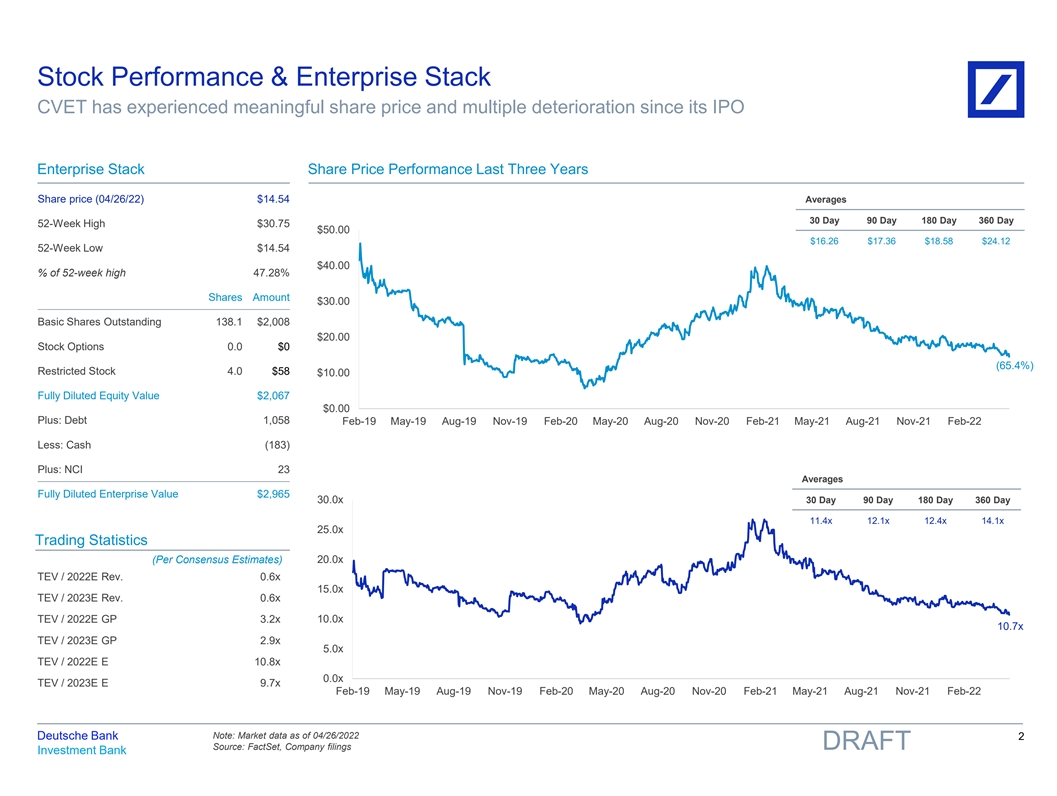 Stock Performance & Enterprise Stack CVET has experienced meaningful share price and multiple deterioration since its IPO Enterprise Stack Share Price Performance Last Three Years Share price (04/26/22) $14.54 Averages 30 Day 90 Day 180 Day 360 Day 52-Week High $30.75 $50.00 $16.26 $17.36 $18.58 $24.12 52-Week Low $14.54 $40.00 % of 52-week high 47.28% Shares Amount $30.00 Basic Shares Outstanding 138.1 $2,008 $20.00 Stock Options 0.0 $0 (65.4%) Restricted Stock 4.0 $58 $10.00 Fully Diluted Equity Value $2,067 $0.00 Plus: Debt 1,058 Feb-19 May-19 Aug-19 Nov-19 Feb-20 May-20 Aug-20 Nov-20 Feb-21 May-21 Aug-21 Nov-21 Feb-22 Less: Cash (183) Plus: NCI 23 Averages Fully Diluted Enterprise Value $2,965 30 Day 90 Day 180 Day 360 Day 30.0x 11.4x 12.1x 12.4x 14.1x 25.0x Trading Statistics 20.0x (Per Consensus Estimates) TEV / 2022E Rev. 0.6x 15.0x TEV / 2023E Rev. 0.6x TEV / 2022E GP 3.2x 10.0x 10.7x TEV / 2023E GP 2.9x 5.0x TEV / 2022E E 10.8x 0.0x TEV / 2023E E 9.7x Feb-19 May-19 Aug-19 Nov-19 Feb-20 May-20 Aug-20 Nov-20 Feb-21 May-21 Aug-21 Nov-21 Feb-22 Note: Market data as of 04/26/2022 Deutsche Bank 2 Source: FactSet, Company filings DRAFT Investment Bank 81nidZpGqzkSDMpD