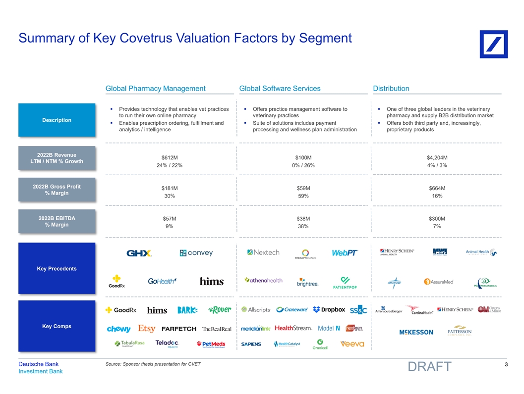 Summary of Key Covetrus Valuation Factors by Segment Global Pharmacy Management Global Software Services Distribution ▪ Provides technology that enables vet practices ▪ Offers practice management software to ▪ One of three global leaders in the veterinary to run their own online pharmacy veterinary practices pharmacy and supply B2B distribution market Description ▪ Enables prescription ordering, fulfillment and ▪ Suite of solutions includes payment ▪ Offers both third party and, increasingly, analytics / intelligence processing and wellness plan administration proprietary products 2022B Revenue $612M $100M $4,204M LTM / NTM % Growth 24% / 22% 0% / 26% 4% / 3% 2022B Gross Profit $181M $59M $664M % Margin 30% 59% 16% 2022B EBITDA $57M $38M $300M % Margin 9% 38% 7% Key Precedents Key Comps Source: Sponsor thesis presentation for CVET Deutsche Bank 3 DRAFT Investment Bank 81nidZpGqzkSDMpD