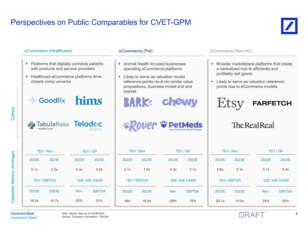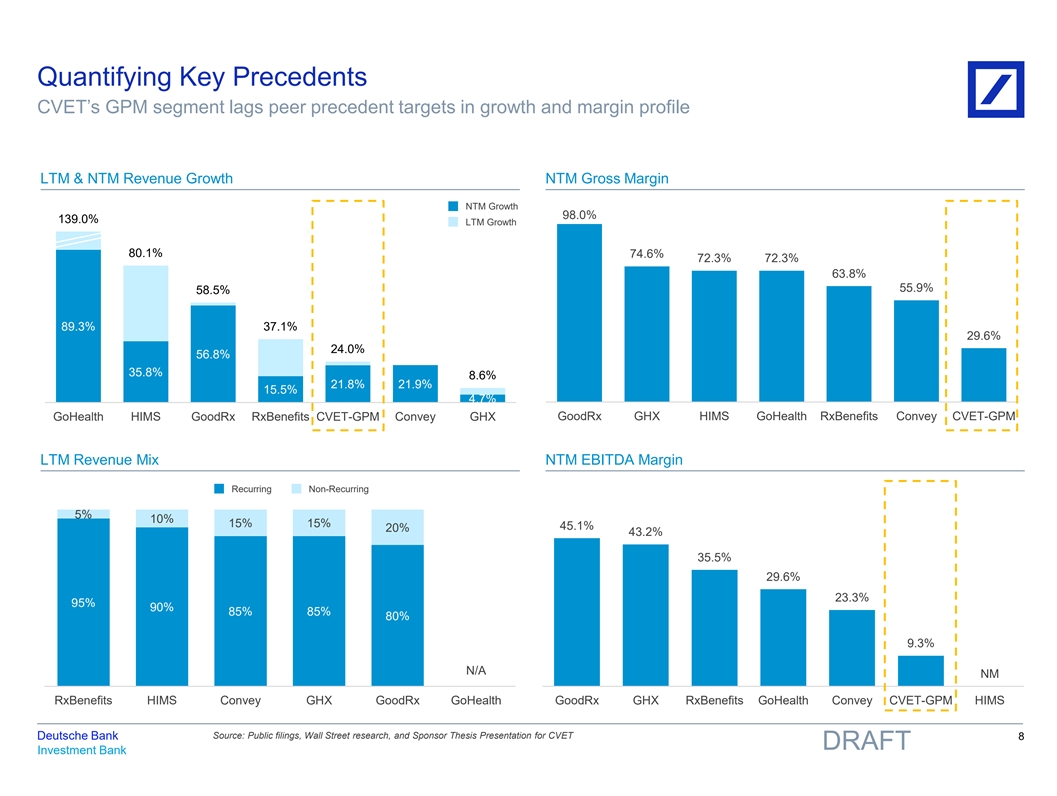 Quantifying Key Precedents CVET’s GPM segment lags peer precedent targets in growth and margin profile LTM & NTM Revenue Growth NTM Gross Margin NTM Growth 98.0% 139.0% LTM Growth 80.1% 74.6% 72.3% 72.3% 63.8% 55.9% 58.5% 89.3% 37.1% 29.6% 24.0% 56.8% 35.8% 8.6% 21.8% 21.9% 15.5% 4.7% GoodRx GHX HIMS GoHealth RxBenefits Convey CVET-GPM GoHealth HIMS GoodRx RxBenefits CVET-GPM Convey GHX LTM Revenue Mix NTM EBITDA Margin Recurring Non-Recurring 5% 10% 15% 15% 45.1% 20% 43.2% 35.5% 29.6% 23.3% 95% 90% 85% 85% 80% 9.3% N/A NM -- RxBenefits HIMS Convey GHX GoodRx GoHealth GoodRx GHX RxBenefits GoHealth Convey CVET-GPM HIMS Source: Public filings, Wall Street research, and Sponsor Thesis Presentation for CVET Deutsche Bank 8 DRAFT Investment Bank 81nidZpGqzkSDMpD
