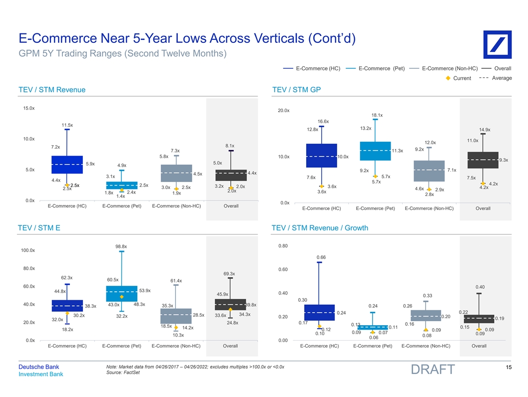 E-Commerce Near 5-Year Lows Across Verticals GPM 5Y Trading Ranges (NTM) E-Commerce (HC) E-Commerce (Pet) E-Commerce (Non-HC) Overall Average Current TEV / NTM Revenue TEV / NTM GP 20.0x 30.0x 15.2x 22.1x 21.6x 15.0x 18.9x 20.0x 16.8x 16.0x 10.4x 15.0x 13.5x 9.1x 9.1x 10.0x 14.2x 11.6x 12.6x 7.1x 11.7x 7.4x 6.4x 5.9x 10.0x 11.5x 8.9x 5.6x 5.5x 7.8x 5.0x 9.2x 9.3x 5.4x 3.7x 5.6x 7.2x 2.7x 3.3x 3.0x 4.0x 4.6x 2.5x 3.6x 5.5x 3.8x 5.2x 3.1x 2.4x 2.5x 4.4x 2.3x 2.2x 3.3x 1.7x 0.0x 0.0x E-Commerce (Healthcare) E-Commerce (Pet) E-Commerce (Non-HC) Overall E-Commerce E-Commerce (Pet) E-Commerce (Non-HC) Overall (Healthcare) TEV / NTM E TEV / NTM Revenue / Growth 99.0x 100.0x 0.50 0.47 0.42 0.39 86.7x 80.0x 0.40 66.2x 70.5x 63.9x 58.4x 0.28 60.0x 0.30 0.26 53.7x 51.7x 0.23 59.7x 0.21 0.22 0.22 44.1x 37.5x 40.0x 0.20 37.9x 0.19 36.5x 0.14 37.2x 31.4x 0.18 0.16 0.15 0.13 24.2x 0.12 0.12 0.15 21.7x 24.5x 20.0x 0.10 19.5x 25.1x 0.09 0.10 19.6x 18.7x 0.09 0.09 0.08 14.6x 0.07 11.8x 0.0x 0.00 E-Commerce (HC) E-Commerce (Pet) E-Commerce (Non-HC) Overall E-Commerce E-Commerce (Pet) E-Commerce (Non-HC) Overall (Healthcare) Note: Market data from 04/26/2017 – 04/26/2022; excludes multiples >100.0x or <0.0x Deutsche Bank 14 Source: FactSet DRAFT Investment Bank 81nidZpGqzkSDMpD