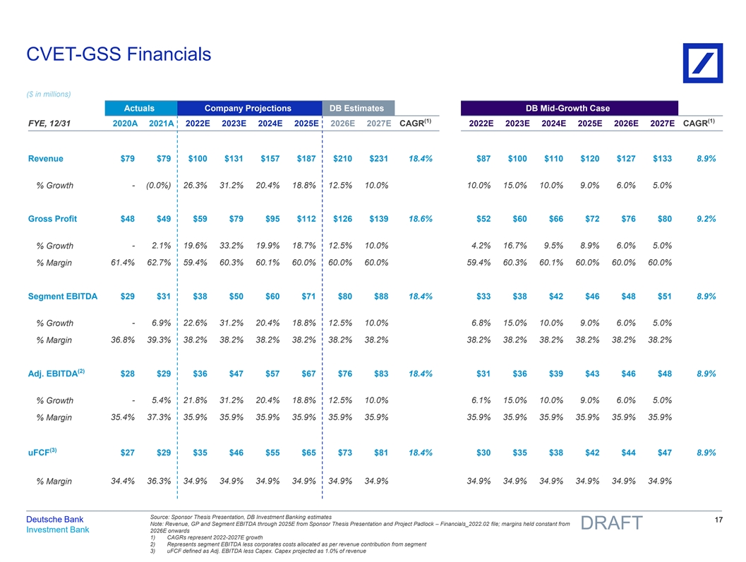 CVET-GSS Financials ($ in millions) Actuals Company Projections DB Estimates DB Mid-Growth Case (1) (1) FYE, 12/31 2020A 2021A 2022E 2023E 2024E 2025E 2026E 2027E CAGR 2022E 2023E 2024E 2025E 2026E 2027E CAGR Revenue $79 $79 $100 $131 $157 $187 $210 $231 18.4% $87 $100 $110 $120 $127 $133 8.9% % Growth - (0.0%) 26.3% 31.2% 20.4% 18.8% 12.5% 10.0% 10.0% 15.0% 10.0% 9.0% 6.0% 5.0% Gross Profit $48 $49 $59 $79 $95 $112 $126 $139 18.6% $52 $60 $66 $72 $76 $80 9.2% % Growth - 2.1% 19.6% 33.2% 19.9% 18.7% 12.5% 10.0% 4.2% 16.7% 9.5% 8.9% 6.0% 5.0% % Margin 61.4% 62.7% 59.4% 60.3% 60.1% 60.0% 60.0% 60.0% 59.4% 60.3% 60.1% 60.0% 60.0% 60.0% Segment EBITDA $29 $31 $38 $50 $60 $71 $80 $88 18.4% $33 $38 $42 $46 $48 $51 8.9% - 6.9% 22.6% 31.2% 20.4% 18.8% 12.5% 10.0% 6.8% 15.0% 10.0% 9.0% 6.0% 5.0% % Growth 36.8% 39.3% 38.2% 38.2% 38.2% 38.2% 38.2% 38.2% 38.2% 38.2% 38.2% 38.2% 38.2% 38.2% % Margin (2) Adj. EBITDA $28 $29 $36 $47 $57 $67 $76 $83 18.4% $31 $36 $39 $43 $46 $48 8.9% - 5.4% 21.8% 31.2% 20.4% 18.8% 12.5% 10.0% 6.1% 15.0% 10.0% 9.0% 6.0% 5.0% % Growth 35.4% 37.3% 35.9% 35.9% 35.9% 35.9% 35.9% 35.9% 35.9% 35.9% 35.9% 35.9% 35.9% 35.9% % Margin (3) uFCF $27 $29 $35 $46 $55 $65 $73 $81 18.4% $30 $35 $38 $42 $44 $47 8.9% % Margin 34.4% 36.3% 34.9% 34.9% 34.9% 34.9% 34.9% 34.9% 34.9% 34.9% 34.9% 34.9% 34.9% 34.9% Source: Sponsor Thesis Presentation, DB Investment Banking estimates Deutsche Bank 17 Note: Revenue, GP and Segment EBITDA through 2025E from Sponsor Thesis Presentation and Project Padlock – Financials_2022.02 file; margins held constant from DRAFT Investment Bank 2026E onwards 1) CAGRs represent 2022-2027E growth 2) Represents segment EBITDA less corporates costs allocated as per revenue contribution from segment 3) uFCF defined as Adj. EBITDA less Capex. Capex projected as 1.0% of revenue 81nidZpGqzkSDMpD