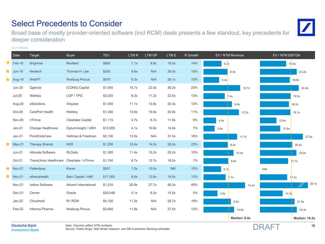 Select Precedents to Consider Broad base of mostly provider-oriented software (incl RCM) deals presents a few standout, key precedents for deeper consideration ($ in millions) Date Target Buyer TEV LTM R LTM GP LTM E R Growth EV / NTM Revenue EV / NTM EBITDA Feb-16 Brightree ResMed $800 7.1x 9.8x 19.0x 14% 6.2x 16.5x Jun-19 Nextech Thomas H. Lee $550 9.6x N/A 26.0x 15% 8.3x 23.2x Aug-19 WebPT Warburg Pincus $675 6.3x N/A 28.1x 15% 5.4x 18.8x Jun-20 Qgenda ICONIQ Capital $1,050 15.7x 22.0x 36.2x 23% 12.7x 24.4x Jul-20 Wellsky LGP / TPG $3,025 8.3x 11.2x 22.6x 13% 7.4x 19.3x Aug-20 eSolutions Waystar $1,350 11.1x 13.8x 20.3x 12% 9.9x 18.2x Oct-20 CarePort Health Wellsky $1,350 13.6x 15.6x 20.9x 11% 12.3x 19.1x Nov-20 nThrive Clearlake Capital $1,115 4.7x 6.7x 11.9x 9% 4.4x 10.4x Jan-21 Change Healthcare OptumInsight / UNH $13,000 4.1x 10.6x 14.0x 7% 3.9x 12.8x Jan-21 PointClickCare Hellman & Friedman $3,130 13.5x N/A 31.0x 16% 11.7x 27.0x May-21 Therapy Brands KKR $1,200 10.4x 14.0x 28.0x 23% 8.4x 20.4x Jun-21 Allocate Software RLDatix $1,300 11.4x 15.2x 29.2x 10% 10.4x 23.0x Oct-21 TransUnion Healthcare Clearlake / nThrive $1,740 8.7x 13.7x 18.2x 1% 8.6x 17.7x Nov-21 Patientpop Kareo $507 7.0x 10.0x NM 15% 6.1x NM Nov-21 athenahealth Bain Capital / H&F $17,000 8.6x 12.6x 19.0x 12% 7.7x 17.2x 38.1x Nov-21 Iodine Software Advent International $1,210 20.9x 27.7x 56.2x 45% 14.4x Dec-21 Cerner Oracle $29,548 5.1x 6.2x 15.5x 5% 4.9x 14.3x Jan-22 Cloudmed R1 RCM $4,100 11.3x N/A 28.7x 19% 9.5x 21.8x Feb-22 Informa Pharma Warburg Pincus $2,600 11.9x N/A 27.5x 12% 10.6x 23.2x Median: 8.4x Median: 19.2x Note: Columns reflect NTM multiples Deutsche Bank 18 Source: Public filings, Wall Street research, and DB Investment Banking estimates DRAFT Investment Bank 81nidZpGqzkSDMpD
