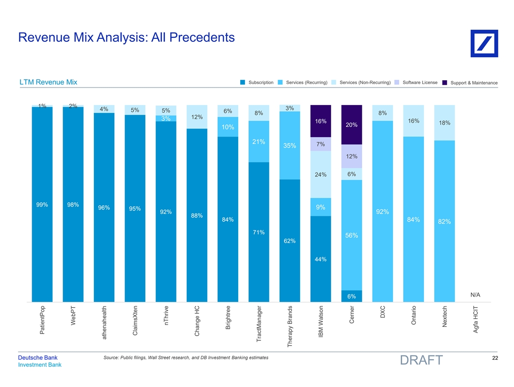 Revenue Mix Analysis: All Precedents LTM Revenue Mix Subscription Services (Recurring) Services (Non-Recurring) Software License Support & Maintenance 1% 2% 3% 4% 5% 5% 6% 8% 8% 12% 3% 16% 16% 18% 20% 10% 21% 7% 35% 12% 6% 24% 99% 98% 9% 96% 95% 92% 92% 88% 84% 84% 82% 71% 56% 62% 44% N/A 6% Source: Public filings, Wall Street research, and DB Investment Banking estimates Deutsche Bank 22 DRAFT Investment Bank PatientPop WebPT athenahealth ClaimsXten nThrive Change HC Brightree TractManager Therapy Brands IBM Watson Cerner DXC Ontario Nextech Agfa HCIT 81nidZpGqzkSDMpD