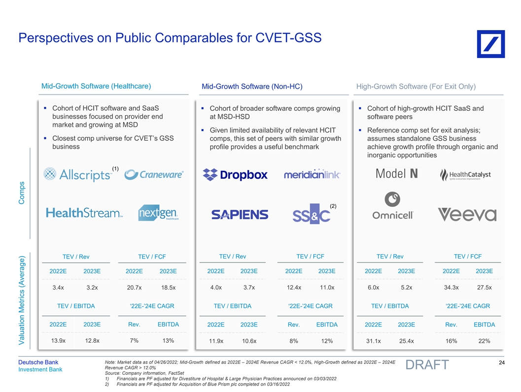 Perspectives on Public Comparables for CVET-GSS Mid-Growth Software (Healthcare) Mid-Growth Software (Non-HC) High-Growth Software (For Exit Only) ▪ Cohort of HCIT software and SaaS ▪ Cohort of broader software comps growing ▪ Cohort of high-growth HCIT SaaS and businesses focused on provider end at MSD-HSD software peers market and growing at MSD ▪ Given limited availability of relevant HCIT ▪ Reference comp set for exit analysis; ▪ Closest comp universe for CVET’s GSS comps, this set of peers with similar growth assumes standalone GSS business business profile provides a useful benchmark achieve growth profile through organic and inorganic opportunities (1) (2) TEV / Rev TEV / FCF TEV / Rev TEV / FCF TEV / Rev TEV / FCF 2022E 2023E 2022E 2023E 2022E 2023E 2022E 2023E 2022E 2023E 2022E 2023E 3.4x 3.2x 20.7x 18.5x 4.0x 3.7x 12.4x 11.0x 6.0x 5.2x 34.3x 27.5x TEV / EBITDA ‘22E-’24E CAGR TEV / EBITDA ‘22E-’24E CAGR TEV / EBITDA ‘22E-’24E CAGR 2022E 2023E Rev. EBITDA 2022E 2023E Rev. EBITDA 2022E 2023E Rev. EBITDA 13.9x 12.8x 7% 13% 11.9x 10.6x 8% 12% 31.1x 25.4x 16% 22% Note: Market data as of 04/26/2022; Mid-Growth defined as 2022E – 2024E Revenue CAGR < 12.0%, High-Growth defined as 2022E – 2024E Deutsche Bank 24 Revenue CAGR > 12.0% DRAFT Investment Bank Source: Company information, FactSet 1) Financials are PF adjusted for Divestiture of Hospital & Large Physician Practices announced on 03/03/2022 2) Financials are PF adjusted for Acquisition of Blue Prism plc completed on 03/16/2022 Valuation Metrics (Average) Comps 81nidZpGqzkSDMpD