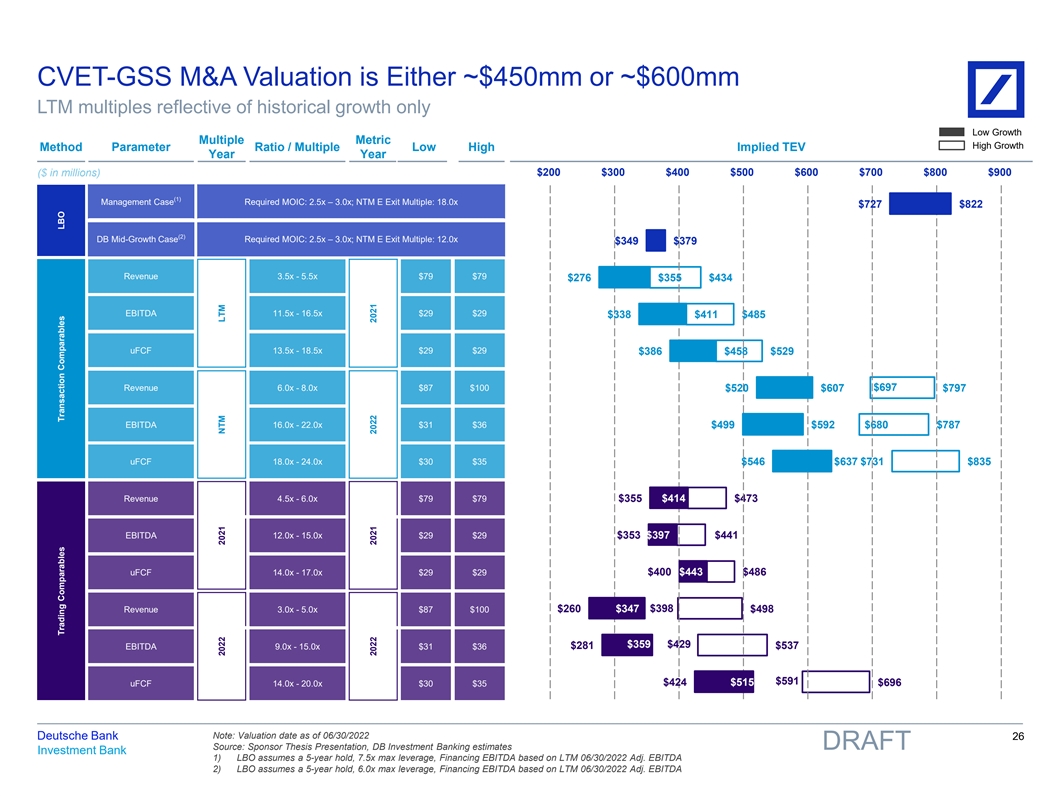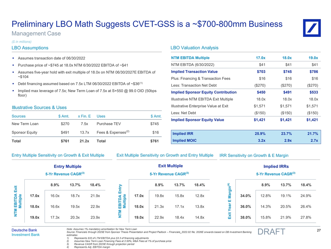 CVET-GSS M&A Valuation is Either ~$450mm or ~$600mm LTM multiples reflective of historical growth only Low Growth Multiple Metric High Growth Method Parameter Ratio / Multiple Low High Implied TEV Year Year ($ in millions) $200 $200 $300 $300 $400 $400 $500 $500 $600 $600 $700 $700 $800 $800 $900 $900 (1) Management Case Required MOIC: 2.5x – 3.0x; NTM E Exit Multiple: 18.0x $727 $822 (2) DB Mid-Growth Case Required MOIC: 2.5x – 3.0x; NTM E Exit Multiple: 12.0x $349 $379 Revenue 3.5x - 5.5x $79 $79 $276 $355 $434 EBITDA 11.5x - 16.5x $29 $29 $338 $411 $485 uFCF 13.5x - 18.5x $29 $29 $386 $458 $458 $529 Revenue 6.0x - 8.0x $87 $100 $697 $520 $607 $797 EBITDA 16.0x - 22.0x $31 $36 $499 $592 $680 $787 uFCF 18.0x - 24.0x $30 $35 $546 $637 $731 $835 Revenue 4.5x - 6.0x $79 $79 $355 $414 $473 EBITDA 12.0x - 15.0x $29 $29 $353 $397 $441 uFCF 14.0x - 17.0x $29 $29 $400 $443 $486 $260 $347 $398 $498 Revenue 3.0x - 5.0x $87 $100 $359 $429 EBITDA 9.0x - 15.0x $31 $36 $281 $537 $591 uFCF 14.0x - 20.0x $30 $35 $424 $515 $696 Note: Valuation date as of 06/30/2022 Deutsche Bank 26 Source: Sponsor Thesis Presentation, DB Investment Banking estimates DRAFT Investment Bank 1) LBO assumes a 5-year hold, 7.5x max leverage, Financing EBITDA based on LTM 06/30/2022 Adj. EBITDA 2) LBO assumes a 5-year hold, 6.0x max leverage, Financing EBITDA based on LTM 06/30/2022 Adj. EBITDA Trading Comparables Transaction Comparables LBO 2022 2021 NTM LTM 2022 2021 2022 2021 81nidZpGqzkSDMpD