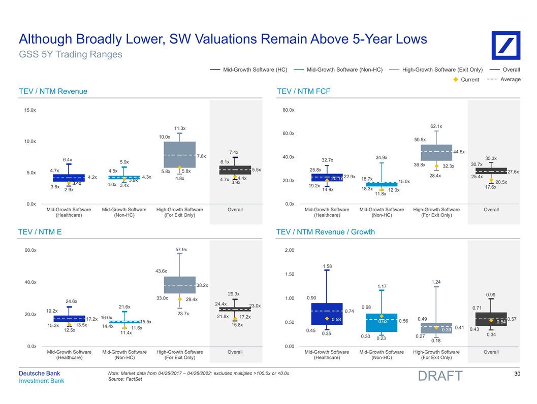 Although Broadly Lower, SW Valuations Remain Above 5-Year Lows GSS 5Y Trading Ranges Mid-Growth Software (HC) Mid-Growth Software (Non-HC) High-Growth Software (Exit Only) Overall Average Current TEV / NTM Revenue TEV / NTM FCF 15.0x 80.0x 62.1x 11.3x 60.0x 10.0x 50.5x 10.0x 44.5x 7.4x 7.8x 40.0x 34.9x 35.3x 6.4x 32.7x 5.9x 6.1x 30.7x 36.8x 32.3x 5.5x 25.8x 4.7x 4.5x 5.8x 5.8x 27.6x 5.0x 28.4x 22.9x 25.4x 4.2x 4.3x 4.8x 4.4x 20.1x 18.7x 4.7x 3.9x 20.0x 15.0x 3.9x 20.5x 3.4x 4.0x 3.4x 19.2x 3.6x 17.6x 18.3x 2.9x 14.9x 12.0x 11.8x 0.0x 0.0x Mid-Growth Software Mid-Growth Software High-Growth Software Overall Mid-Growth Software Mid-Growth Software High-Growth Software Overall (Healthcare) (Non-HC) (For Exit Only) (Healthcare) (Non-HC) (For Exit Only) TEV / NTM E TEV / NTM Revenue / Growth 57.9x 60.0x 2.00 1.58 43.6x 1.50 1.24 40.0x 38.2x 1.17 29.3x 0.99 33.0x 1.00 0.90 29.4x 24.6x 24.4x 23.0x 21.6x 0.68 0.71 19.2x 0.74 23.7x 20.0x 21.8x 17.2x 16.0x 17.2x 0.49 0.57 0.58 0.63 0.56 15.5x 0.54 0.50 15.3x 13.5x 15.8x 14.4x 0.41 11.6x 0.43 12.5x 0.39 0.45 11.4x 0.35 0.34 0.27 0.30 0.23 0.18 0.0x 0.00 Mid-Growth Software Mid-Growth Software High-Growth Software Overall Mid-Growth Software Mid-Growth Software High-Growth Software Overall (Healthcare) (Non-HC) (For Exit Only) (Healthcare) (Non-HC) (For Exit Only) Note: Market data from 04/26/2017 – 04/26/2022; excludes multiples >100.0x or <0.0x Deutsche Bank 30 Source: FactSet DRAFT Investment Bank 81nidZpGqzkSDMpD