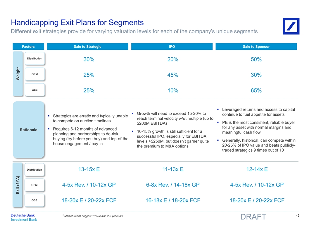 Handicapping Exit Plans for Segments Different exit strategies provide for varying valuation levels for each of the company’s unique segments Factors Sale to Strategic IPO Sale to Sponsor Distribution 30% 20% 50% GPM 25% 45% 30% GSS 25% 10% 65% ▪ Leveraged returns and access to capital ▪ Growth will need to exceed 15-20% to continue to fuel appetite for assets ▪ Strategics are erratic and typically unable reach terminal velocity w/r/t multiple (up to to compete on auction timelines ▪ PE is the most consistent, reliable buyer $200M EBITDA) for any asset with normal margins and ▪ Requires 6-12 months of advanced Rationale ▪ 10-15% growth is still sufficient for a meaningful cash flow planning and partnerships to de-risk successful IPO, especially for EBITDA buying (try before you buy) and top-of-the- ▪ Generally, historical, can compete within levels >$250M, but doesn’t garner quite house engagement / buy-in 20-25% of IPO value and beats publicly- the premium to M&A options traded strategics 9 times out of 10 Distribution 13-15x E 11-13x E 12-14x E GPM 4-5x Rev. / 10-12x GP 6-8x Rev. / 14-18x GP 4-5x Rev. / 10-12x GP GSS 18-20x E / 20-22x FCF 16-18x E / 18-20x FCF 18-20x E / 20-22x FCF Deutsche Bank 45 * Market trends suggest 10% upside 2-3 years out DRAFT Investment Bank Exit (5YA) Weight 81nidZpGqzkSDMpD