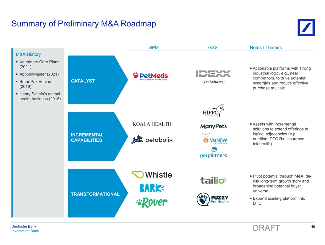 Summary of Preliminary M&A Roadmap GPM GSS Notes / Themes M&A History ▪ Veterinary Care Plans (2021) ▪ Actionable platforms with strong industrial logic, e.g., near ▪ AppointMaster (2021) competitors, to drive potential CATALYST ▪ SmartPak Equine (Vet Software) synergies and reduce effective (2019) purchase multiple ▪ Henry Schein’s animal health business (2018) ▪ Assets with incremental solutions to extend offerings to logical adjacencies (e.g. INCREMENTAL nutrition, DTC Rx; insurance, CAPABILITIES telehealth) ▪ Pivot potential through M&A, de- risk long-term growth story and broadening potential buyer universe TRANSFORMATIONAL ▪ Expand existing platform into DTC Deutsche Bank 49 DRAFT Investment Bank 81nidZpGqzkSDMpD
