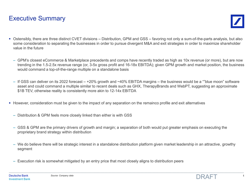 Executive Summary ▪ Ostensibly, there are three distinct CVET divisions – Distribution, GPM and GSS – favoring not only a sum-of-the-parts analysis, but also some consideration to separating the businesses in order to pursue divergent M&A and exit strategies in order to maximize shareholder value in the future – GPM’s closest eCommerce & Marketplace precedents and comps have recently traded as high as 10x revenue (or more), but are now trending in the 1.5-2.5x revenue range (or, 3-5x gross profit and 16-18x EBITDA); given GPM growth and market position, the business would command a top-of-the-range multiple on a standalone basis – If GSS can deliver on its 2022 forecast – +20% growth and ~40% EBITDA margins – the business would be a “”blue moon” software asset and could command a multiple similar to recent deals such as GHX, TherapyBrands and WebPT, suggesting an approximate $1B TEV, otherwise reality is consistently more akin to 12-14x EBITDA ▪ However, consideration must be given to the impact of any separation on the remainco profile and exit alternatives – Distribution & GPM feels more closely linked than either is with GSS – GSS & GPM are the primary drivers of growth and margin; a separation of both would put greater emphasis on executing the proprietary brand strategy within distribution – We do believe there will be strategic interest in a standalone distribution platform given market leadership in an attractive, growthy segment – Execution risk is somewhat mitigated by an entry price that most closely aligns to distribution peers Source: Company data Deutsche Bank 1 DRAFT Investment Bank 81nidZpGqzkSDMpD