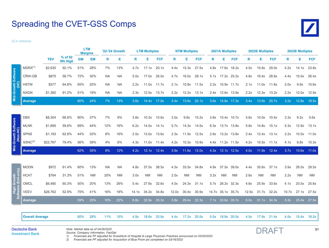Spreading the CVET-GSS Comps ($ in millions) LTM '22-'24 Growth LTM Multiples NTM Multiples 2021A Multiples 2022E Multiples 2023E Multiples Margins % of 52 TEV GM EM R E R E FCF R E FCF R E FCF R E FCF R E FCF Wk High (1) MDRX $2,635 92.1% 51% 28% 7% 13% 4.7x 17.1x 20.1x 4.4x 15.3x 27.5x 4.8x 17.6x 18.2x 4.5x 15.8x 29.0x 4.2x 14.1x 23.8x CRW-GB $875 56.7% 72% 30% NA NA 5.0x 17.0x 26.0x 4.7x 16.0x 28.1x 5.1x 17.2x 25.2x 4.8x 16.4x 28.6x 4.4x 15.0x 26.4x HSTM $577 64.8% 65% 20% NA NA 2.2x 11.0x 11.7x 2.1x 10.8x 11.5x 2.2x 10.9x 11.7x 2.1x 11.0x 11.8x 2.0x 9.9x 10.6x NXGN $1,382 91.2% 51% 19% NA NA 2.3x 12.5x 13.7x 2.2x 12.2x 13.1x 2.4x 12.6x 13.9x 2.2x 12.3x 13.2x 2.2x 12.0x 12.9x Average 60% 24% 7% 13% 3.6x 14.4x 17.9x 3.4x 13.6x 20.1x 3.6x 14.6x 17.3x 3.4x 13.9x 20.7x 3.2x 12.8x 18.5x DBX $8,304 66.6% 80% 37% 7% 9% 3.8x 10.3x 10.6x 3.5x 9.8x 10.2x 3.8x 10.4x 10.7x 3.6x 10.0x 10.4x 3.3x 9.2x 9.6x MLNK $1,695 59.6% 69% 44% 12% 16% 6.2x 14.0x 14.1x 5.7x 14.3x 14.5x 6.3x 13.7x 13.8x 5.8x 14.8x 15.1x 5.3x 12.9x 13.1x SPNS $1,193 62.8% 44% 20% 8% 16% 2.5x 13.0x 13.6x 2.3x 11.9x 12.5x 2.6x 13.2x 13.8x 2.4x 12.4x 13.1x 2.2x 10.5x 11.0x (2) SSNC $22,767 79.4% 56% 39% 4% 6% 4.3x 11.0x 11.4x 4.2x 10.3x 10.9x 4.4x 11.2x 11.5x 4.2x 10.5x 11.1x 4.1x 9.8x 10.3x Average 62% 35% 8% 12% 4.2x 12.1x 12.4x 3.9x 11.6x 12.0x 4.3x 12.1x 12.5x 4.0x 11.9x 12.4x 3.7x 10.6x 11.0x MODN $972 61.4% 60% 13% NA NA 4.8x 37.0x 38.5x 4.3x 33.5x 34.8x 4.9x 37.5x 39.0x 4.4x 35.6x 37.1x 3.9x 28.5x 29.5x HCAT $764 31.3% 51% NM 20% NM 3.0x NM NM 2.5x NM NM 3.2x NM NM 2.6x NM NM 2.2x NM NM OMCL $6,480 60.3% 50% 20% 13% 26% 5.4x 27.6x 32.6x 4.5x 24.3x 31.1x 5.7x 28.2x 32.3x 4.6x 25.9x 33.6x 4.1x 20.5x 25.6x VEEV $26,762 52.9% 75% 41% 16% 18% 14.1x 34.2x 34.8x 12.0x 30.4x 30.9x 14.7x 35.1x 35.7x 12.5x 31.7x 32.2x 10.7x 27.1x 27.5x Average 59% 25% 16% 22% 6.8x 32.9x 35.3x 5.8x 29.4x 32.3x 7.1x 33.6x 35.7x 6.0x 31.1x 34.3x 5.2x 25.4x 27.5x Overall Average 60% 28% 11% 15% 4.9x 18.6x 20.6x 4.4x 17.2x 20.5x 5.0x 18.9x 20.5x 4.5x 17.9x 21.4x 4.0x 15.4x 18.2x Note: Market data as of 04/26/2022 Deutsche Bank 51 Source: Company information, FactSet DRAFT Investment Bank 1) Financials are PF adjusted for Divestiture of Hospital & Large Physician Practices announced on 03/03/2022 2) Financials are PF adjusted for Acquisition of Blue Prism plc completed on 03/16/2022 High Growth Mid-Growth Software Mid-Growth Software Software (Exit-only) (Non-HC) (HC) 81nidZpGqzkSDMpD
