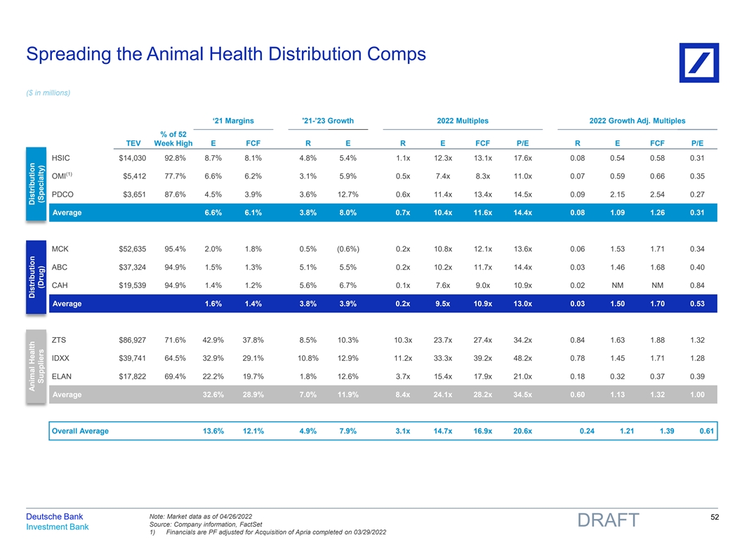 Spreading the Animal Health Distribution Comps ($ in millions) ‘21 Margins '21-’23 Growth 2022 Multiples 2022 Growth Adj. Multiples % of 52 TEV Week High E FCF R E R E FCF P/E R E FCF P/E HSIC $14,030 92.8% 8.7% 8.1% 4.8% 5.4% 1.1x 12.3x 13.1x 17.6x 0.08 0.54 0.58 0.31 (1) OMI $5,412 77.7% 6.6% 6.2% 3.1% 5.9% 0.5x 7.4x 8.3x 11.0x 0.07 0.59 0.66 0.35 PDCO $3,651 87.6% 4.5% 3.9% 3.6% 12.7% 0.6x 11.4x 13.4x 14.5x 0.09 2.15 2.54 0.27 Average 6.6% 6.1% 3.8% 8.0% 0.7x 10.4x 11.6x 14.4x 0.08 1.09 1.26 0.31 MCK $52,635 95.4% 2.0% 1.8% 0.5% (0.6%) 0.2x 10.8x 12.1x 13.6x 0.06 1.53 1.71 0.34 ABC $37,324 94.9% 1.5% 1.3% 5.1% 5.5% 0.2x 10.2x 11.7x 14.4x 0.03 1.46 1.68 0.40 CAH $19,539 94.9% 1.4% 1.2% 5.6% 6.7% 0.1x 7.6x 9.0x 10.9x 0.02 NM NM 0.84 Average 1.6% 1.4% 3.8% 3.9% 0.2x 9.5x 10.9x 13.0x 0.03 1.50 1.70 0.53 ZTS $86,927 71.6% 42.9% 37.8% 8.5% 10.3% 10.3x 23.7x 27.4x 34.2x 0.84 1.63 1.88 1.32 IDXX $39,741 64.5% 32.9% 29.1% 10.8% 12.9% 11.2x 33.3x 39.2x 48.2x 0.78 1.45 1.71 1.28 ELAN $17,822 69.4% 22.2% 19.7% 1.8% 12.6% 3.7x 15.4x 17.9x 21.0x 0.18 0.32 0.37 0.39 Average 32.6% 28.9% 7.0% 11.9% 8.4x 24.1x 28.2x 34.5x 0.60 1.13 1.32 1.00 Overall Average 13.6% 12.1% 4.9% 7.9% 3.1x 14.7x 16.9x 20.6x 0.24 1.21 1.39 0.61 Note: Market data as of 04/26/2022 Deutsche Bank 52 Source: Company information, FactSet DRAFT Investment Bank 1) Financials are PF adjusted for Acquisition of Apria completed on 03/29/2022 Animal Health Distribution Distribution Suppliers (Drug) (Specialty) 81nidZpGqzkSDMpD