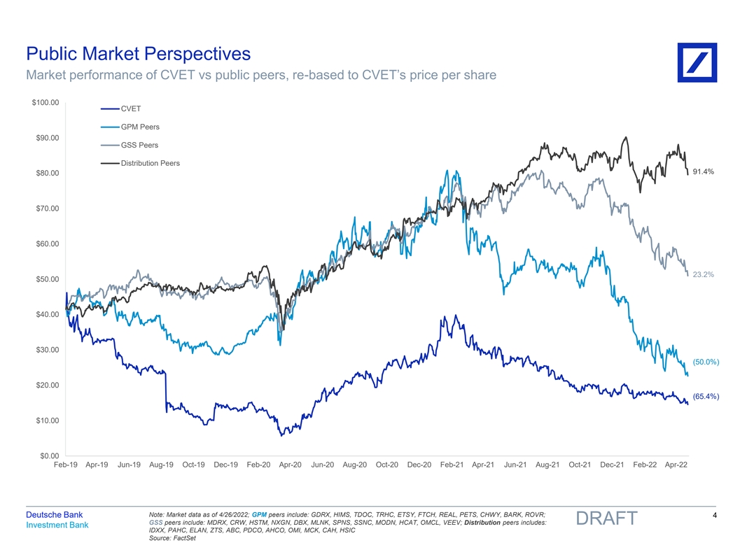 Public Market Perspectives Market performance of CVET vs public peers, re-based to CVET’s price per share $100.00 CVET GPM Peers $90.00 GSS Peers Distribution Peers 91.4% $80.00 $70.00 $60.00 23.2% $50.00 $40.00 $30.00 (50.0%) $20.00 (65.4%) $10.00 $0.00 Feb-19 Apr-19 Jun-19 Aug-19 Oct-19 Dec-19 Feb-20 Apr-20 Jun-20 Aug-20 Oct-20 Dec-20 Feb-21 Apr-21 Jun-21 Aug-21 Oct-21 Dec-21 Feb-22 Apr-22 Note: Market data as of 4/26/2022; GPM peers include: GDRX, HIMS, TDOC, TRHC, ETSY, FTCH, REAL, PETS, CHWY, BARK, ROVR; Deutsche Bank 4 GSS peers include: MDRX, CRW, HSTM, NXGN, DBX, MLNK, SPNS, SSNC, MODN, HCAT, OMCL, VEEV; Distribution peers includes: DRAFT Investment Bank IDXX, PAHC, ELAN, ZTS, ABC, PDCO, AHCO, OMI, MCK, CAH, HSIC Source: FactSet 81nidZpGqzkSDMpD