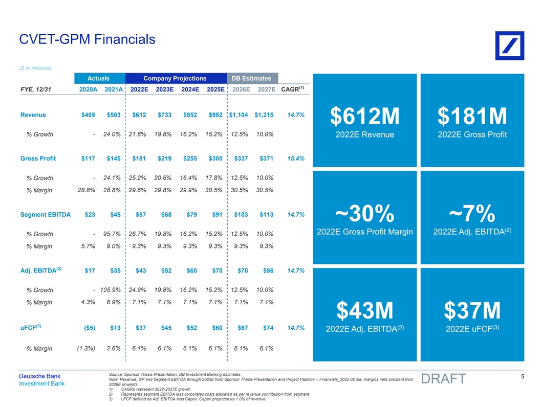 Public Market Perspectives Market performance of CVET vs public peers, re-based to CVET’s price per share $100.00 CVET GPM Peers $90.00 GSS Peers Distribution Peers 91.4% $80.00 $70.00 $60.00 23.2% $50.00 $40.00 $30.00 (50.0%) $20.00 (65.4%) $10.00 $0.00 Feb-19 Apr-19 Jun-19 Aug-19 Oct-19 Dec-19 Feb-20 Apr-20 Jun-20 Aug-20 Oct-20 Dec-20 Feb-21 Apr-21 Jun-21 Aug-21 Oct-21 Dec-21 Feb-22 Apr-22 Note: Market data as of 4/26/2022; GPM peers include: GDRX, HIMS, TDOC, TRHC, ETSY, FTCH, REAL, PETS, CHWY, BARK, ROVR; Deutsche Bank 4 GSS peers include: MDRX, CRW, HSTM, NXGN, DBX, MLNK, SPNS, SSNC, MODN, HCAT, OMCL, VEEV; Distribution peers includes: DRAFT Investment Bank IDXX, PAHC, ELAN, ZTS, ABC, PDCO, AHCO, OMI, MCK, CAH, HSIC Source: FactSet 81nidZpGqzkSDMpD