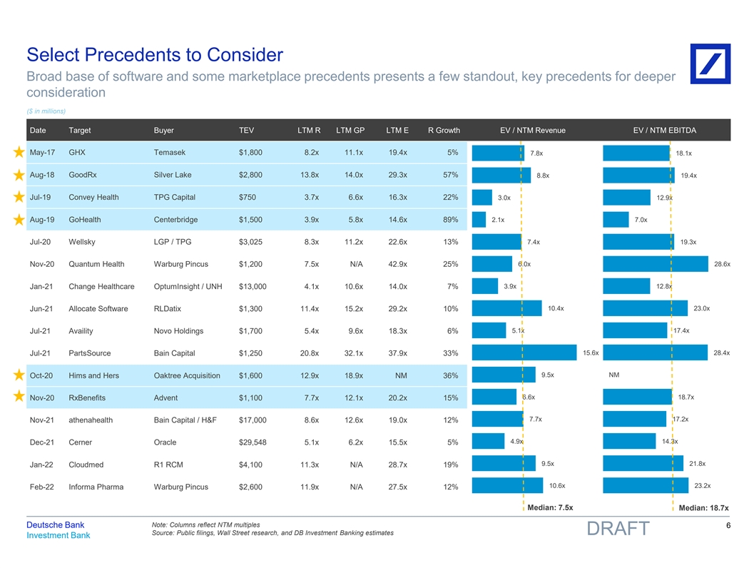 Select Precedents to Consider Broad base of software and some marketplace precedents presents a few standout, key precedents for deeper consideration ($ in millions) Date Target Buyer TEV LTM R LTM GP LTM E R Growth EV / NTM Revenue EV / NTM EBITDA May-17 GHX Temasek $1,800 8.2x 11.1x 19.4x 5% 7.8x 18.1x Aug-18 GoodRx Silver Lake $2,800 13.8x 14.0x 29.3x 57% 8.8x 19.4x Jul-19 Convey Health TPG Capital $750 3.7x 6.6x 16.3x 22% 3.0x 12.9x Aug-19 GoHealth Centerbridge $1,500 3.9x 5.8x 14.6x 89% 2.1x 7.0x Jul-20 Wellsky LGP / TPG $3,025 8.3x 11.2x 22.6x 13% 7.4x 19.3x 6.0x 28.6x Nov-20 Quantum Health Warburg Pincus $1,200 7.5x N/A 42.9x 25% 3.9x 12.8x Jan-21 Change Healthcare OptumInsight / UNH $13,000 4.1x 10.6x 14.0x 7% Jun-21 Allocate Software RLDatix $1,300 11.4x 15.2x 29.2x 10% 10.4x 23.0x 5.1x 17.4x Jul-21 Availity Novo Holdings $1,700 5.4x 9.6x 18.3x 6% 15.6x 28.4x Jul-21 PartsSource Bain Capital $1,250 20.8x 32.1x 37.9x 33% 9.5x NM Oct-20 Hims and Hers Oaktree Acquisition $1,600 12.9x 18.9x NM 36% 6.6x 18.7x Nov-20 RxBenefits Advent $1,100 7.7x 12.1x 20.2x 15% 7.7x 17.2x Nov-21 athenahealth Bain Capital / H&F $17,000 8.6x 12.6x 19.0x 12% 4.9x 14.3x Dec-21 Cerner Oracle $29,548 5.1x 6.2x 15.5x 5% 9.5x 21.8x Jan-22 Cloudmed R1 RCM $4,100 11.3x N/A 28.7x 19% 10.6x 23.2x Feb-22 Informa Pharma Warburg Pincus $2,600 11.9x N/A 27.5x 12% Median: 7.5x Median: 18.7x Note: Columns reflect NTM multiples Deutsche Bank 6 Source: Public filings, Wall Street research, and DB Investment Banking estimates DRAFT Investment Bank 81nidZpGqzkSDMpD