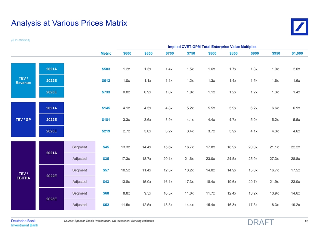 Analysis at Various Prices Matrix ($ in millions) Implied CVET-GPM Total Enterprise Value Multiples $600 $650 $700 $750 $800 $850 $900 $950 $1,000 Metric 2021A $503 1.2x 1.3x 1.4x 1.5x 1.6x 1.7x 1.8x 1.9x 2.0x TEV / 2022E $612 1.0x 1.1x 1.1x 1.2x 1.3x 1.4x 1.5x 1.6x 1.6x Revenue 2023E $733 0.8x 0.9x 1.0x 1.0x 1.1x 1.2x 1.2x 1.3x 1.4x 2021A $145 4.1x 4.5x 4.8x 5.2x 5.5x 5.9x 6.2x 6.6x 6.9x TEV / GP 2022E $181 3.3x 3.6x 3.9x 4.1x 4.4x 4.7x 5.0x 5.2x 5.5x 2023E $219 2.7x 3.0x 3.2x 3.4x 3.7x 3.9x 4.1x 4.3x 4.6x Segment $45 13.3x 14.4x 15.6x 16.7x 17.8x 18.9x 20.0x 21.1x 22.2x 2021A Adjusted $35 17.3x 18.7x 20.1x 21.6x 23.0x 24.5x 25.9x 27.3x 28.8x Segment $57 10.5x 11.4x 12.3x 13.2x 14.0x 14.9x 15.8x 16.7x 17.5x TEV / 2022E EBITDA Adjusted $43 13.8x 15.0x 16.1x 17.3x 18.4x 19.6x 20.7x 21.9x 23.0x Segment $68 8.8x 9.5x 10.3x 11.0x 11.7x 12.4x 13.2x 13.9x 14.6x 2023E Adjusted $52 11.5x 12.5x 13.5x 14.4x 15.4x 16.3x 17.3x 18.3x 19.2x Source: Sponsor Thesis Presentation, DB Investment Banking estimates Deutsche Bank 13 DRAFT Investment Bank 81nidZpGqzkSDMpD