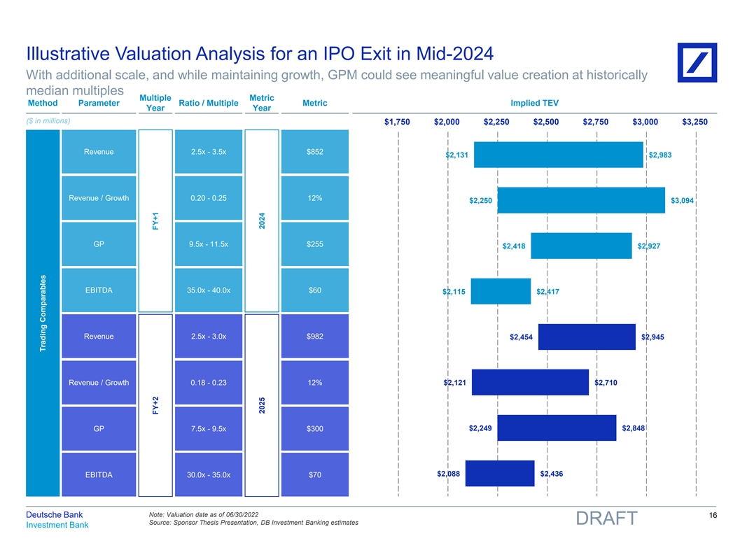 Illustrative Valuation Analysis for an IPO Exit in Mid-2024 With additional scale, and while maintaining growth, GPM could see meaningful value creation at historically median multiples Multiple Metric Method Parameter Ratio / Multiple Metric Implied TEV Year Year ($ in millions) $1,750 $2,000 $2,250 $2,500 $2,750 $3,000 $3,250 Revenue 2.5x - 3.5x $852 $2,131 $2,983 Revenue / Growth 0.20 - 0.25 12% $2,250 $3,094 GP 9.5x - 11.5x $255 $2,418 $2,927 EBITDA 35.0x - 40.0x $60 $2,115 $2,417 Revenue 2.5x - 3.0x $982 $2,454 $2,945 Revenue / Growth 0.18 - 0.23 12% $2,121 $2,710 GP 7.5x - 9.5x $300 $2,249 $2,848 $2,088 $2,436 EBITDA 30.0x - 35.0x $70 Note: Valuation date as of 06/30/2022 Deutsche Bank 16 Source: Sponsor Thesis Presentation, DB Investment Banking estimates DRAFT Investment Bank Trading Comparables FY+2 FY+1 2025 2024 81nidZpGqzkSDMpD
