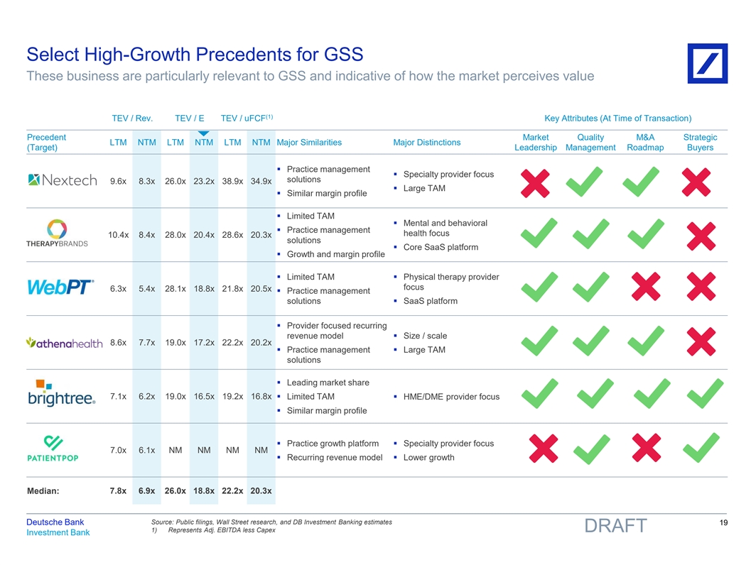 Select High-Growth Precedents for GSS These business are particularly relevant to GSS and indicative of how the market perceives value (1) TEV / Rev. TEV / E TEV / uFCF Key Attributes (At Time of Transaction) Precedent Market Quality M&A Strategic LTM NTM LTM NTM LTM NTM Major Similarities Major Distinctions (Target) Leadership Management Roadmap Buyers ▪ Practice management ▪ Specialty provider focus solutions 9.6x 8.3x 26.0x 23.2x 38.9x 34.9x ▪ Large TAM ▪ Similar margin profile ▪ Limited TAM ▪ Mental and behavioral ▪ Practice management health focus 10.4x 8.4x 28.0x 20.4x 28.6x 20.3x solutions ▪ Core SaaS platform ▪ Growth and margin profile ▪ Limited TAM▪ Physical therapy provider focus 6.3x 5.4x 28.1x 18.8x 21.8x 20.5x ▪ Practice management solutions▪ SaaS platform ▪ Provider focused recurring revenue model▪ Size / scale 8.6x 7.7x 19.0x 17.2x 22.2x 20.2x ▪ Practice management ▪ Large TAM solutions ▪ Leading market share 7.1x 6.2x 19.0x 16.5x 19.2x 16.8x▪ Limited TAM▪ HME/DME provider focus ▪ Similar margin profile ▪ Practice growth platform▪ Specialty provider focus 7.0x 6.1x NM NM NM NM ▪ Recurring revenue model▪ Lower growth Median: 7.8x 6.9x 26.0x 18.8x 22.2x 20.3x Source: Public filings, Wall Street research, and DB Investment Banking estimates Deutsche Bank 19 1) Represents Adj. EBITDA less Capex DRAFT Investment Bank 81nidZpGqzkSDMpD