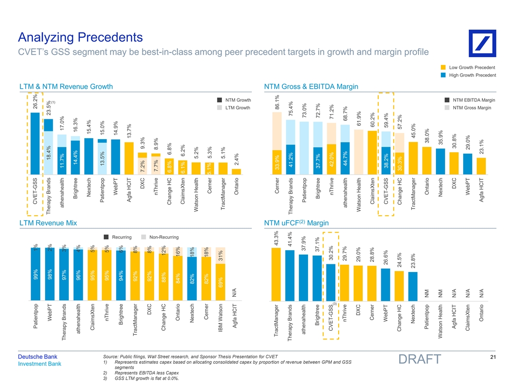 Updated to include FCF multiples Select Low-Growth Precedents for GSS These business are relevant to a GSS with lower anticipated growth (1) TEV / Rev. TEV / E TEV / uFCF Key Attributes (At Time of Transaction) Precedent Market High Quality M&A Strategic LTM NTM LTM NTM LTM NTM Major Similarities Major Distinctions Carvout (Target) Leadership Mgmt Roadmap Buyers ▪ Carve-out business ▪ Payor focused payment 10.5x 9.9x 17.4x 16.5x N/A N/A ▪ Recurring revenue, integrity business software business ▪ Provider focused end ▪ Larger scale RCM platform market 5.1x 4.9x 15.5x 14.3x 18.4x 16.8x ▪ Hospital focus ▪ Similar margin profile ▪ Carve-out transaction 3.7x 3.3x 15.5x 14.1x 16.3x N/A▪ Non-US businesses ▪ Provider focused software HCIT business ▪ Recurring revenue base▪ Payor end market 4.2x 3.9x 14.0x 13.0x 18.4x 15.8x ▪ Margin profile▪ Large scale player ▪ Low growth software model ▪ Also provides solutions to 4.6x 4.5x 12.2x 11.9x N/A N/A ▪ Provider end market government entities exposure ▪ Leader in niche space 5.5x 5.3x 12.3x 11.7x 12.7x 12.2x▪ HCM/WFM solutions ▪ Provider end market ▪ Larger Scale ▪ Similar margin profile 3.8x 3.4x 12.9x 11.2x 13.6x 11.9x ▪ Public sector focused end ▪ Carve-out transaction market ▪ High margin business 5.0x 4.7x 11.6x 11.2x 17.5x 14.7x▪ End-to-end RCM solutions ▪ Carve out transaction ▪ No EBITDA ▪ Low-growth software 2.0x 1.9x NM NM NM NM business ▪ Multiple end market focus Median: 4.6x 4.5x 13.5x 12.4x 16.9x 14.7x Source: Public filings, Wall Street research, and DB Investment Banking estimates Deutsche Bank 20 1) Represents Adj. EBITDA less Capex DRAFT Investment Bank 81nidZpGqzkSDMpD