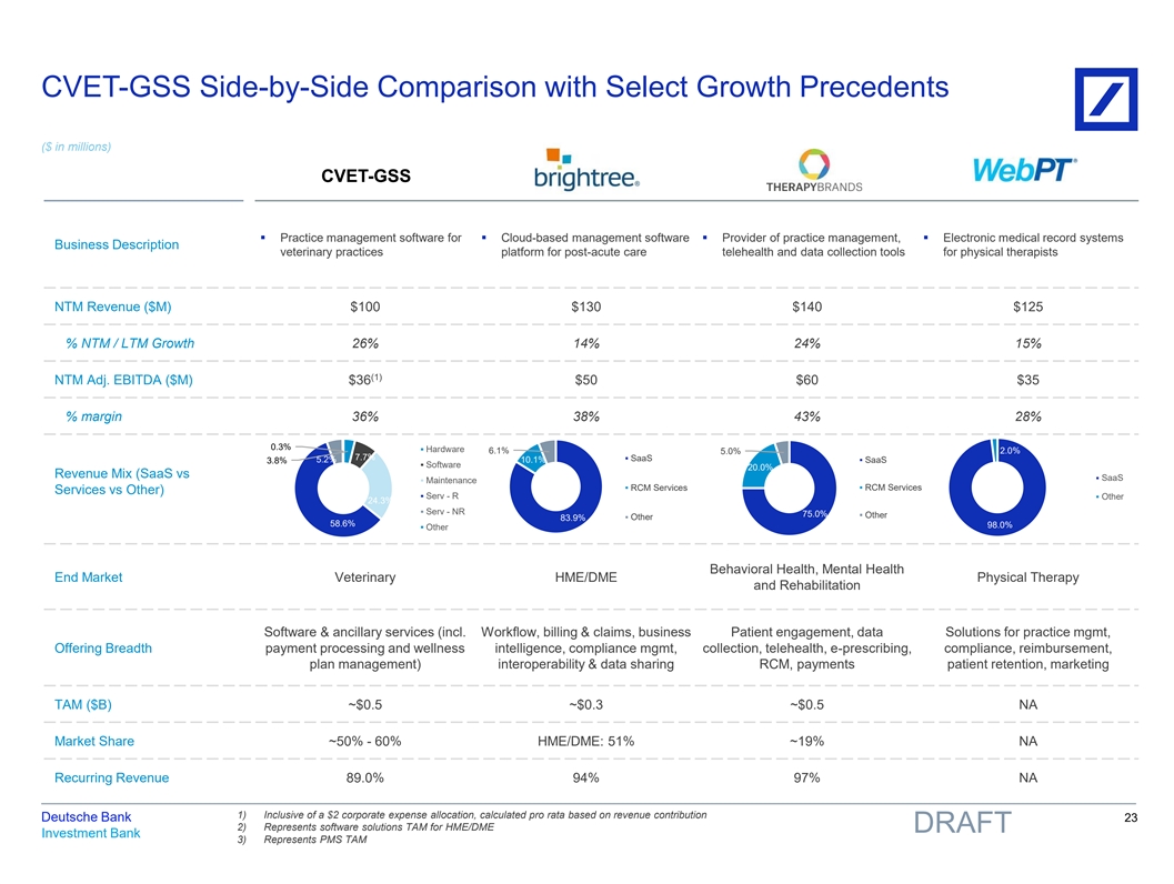 CVET-GSS Side-by-Side Comparison with Select Growth Precedents ($ in millions) CVET-GSS ▪ Practice management software for ▪ Cloud-based management software ▪ Provider of practice management, ▪ Electronic medical record systems Business Description veterinary practices platform for post-acute care telehealth and data collection tools for physical therapists NTM Revenue ($M) $100 $130 $140 $125 % NTM / LTM Growth 26% 14% 24% 15% (1) NTM Adj. EBITDA ($M) $36 $50 $60 $35 % margin 36% 38% 43% 28% 0.3% Hardware 6.1% 5.0% 2.0% 7.7% 5.2% SaaS 3.8% 10.1% SaaS Software 20.0% Revenue Mix (SaaS vs SaaS Maintenance RCM Services RCM Services Services vs Other) Serv - R Other 24.3% Serv - NR 75.0% Other Other 83.9% 58.6% 98.0% Other Behavioral Health, Mental Health End Market Veterinary HME/DME Physical Therapy and Rehabilitation Software & ancillary services (incl. Workflow, billing & claims, business Patient engagement, data Solutions for practice mgmt, Offering Breadth payment processing and wellness intelligence, compliance mgmt, collection, telehealth, e-prescribing, compliance, reimbursement, plan management) interoperability & data sharing RCM, payments patient retention, marketing TAM ($B) ~$0.5 ~$0.3 ~$0.5 NA Market Share ~50% - 60% HME/DME: 51% ~19% NA Recurring Revenue 89.0% 94% 97% NA 1) Inclusive of a $2 corporate expense allocation, calculated pro rata based on revenue contribution Deutsche Bank 23 2) Represents software solutions TAM for HME/DME DRAFT Investment Bank 3) Represents PMS TAM 81nidZpGqzkSDMpD