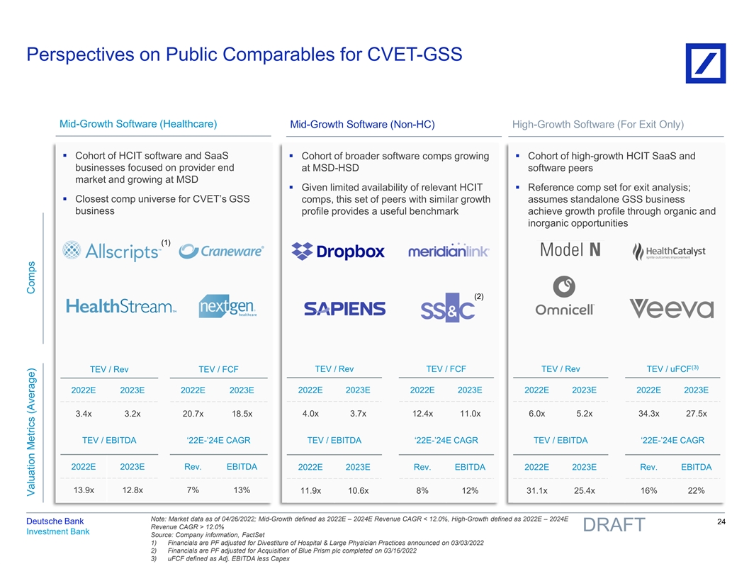Perspectives on Public Comparables for CVET-GSS Mid-Growth Software (Healthcare) Mid-Growth Software (Non-HC) High-Growth Software (For Exit Only) ▪ Cohort of HCIT software and SaaS ▪ Cohort of broader software comps growing ▪ Cohort of high-growth HCIT SaaS and businesses focused on provider end at MSD-HSD software peers market and growing at MSD ▪ Given limited availability of relevant HCIT ▪ Reference comp set for exit analysis; ▪ Closest comp universe for CVET’s GSS comps, this set of peers with similar growth assumes standalone GSS business business profile provides a useful benchmark achieve growth profile through organic and inorganic opportunities (1) (2) (3) TEV / Rev TEV / FCF TEV / Rev TEV / FCF TEV / Rev TEV / uFCF 2022E 2023E 2022E 2023E 2022E 2023E 2022E 2023E 2022E 2023E 2022E 2023E 3.4x 3.2x 20.7x 18.5x 4.0x 3.7x 12.4x 11.0x 6.0x 5.2x 34.3x 27.5x TEV / EBITDA ‘22E-’24E CAGR TEV / EBITDA ‘22E-’24E CAGR TEV / EBITDA ‘22E-’24E CAGR 2022E 2023E Rev. EBITDA 2022E 2023E Rev. EBITDA 2022E 2023E Rev. EBITDA 13.9x 12.8x 7% 13% 11.9x 10.6x 8% 12% 31.1x 25.4x 16% 22% Note: Market data as of 04/26/2022; Mid-Growth defined as 2022E – 2024E Revenue CAGR < 12.0%, High-Growth defined as 2022E – 2024E Deutsche Bank 24 Revenue CAGR > 12.0% DRAFT Investment Bank Source: Company information, FactSet 1) Financials are PF adjusted for Divestiture of Hospital & Large Physician Practices announced on 03/03/2022 2) Financials are PF adjusted for Acquisition of Blue Prism plc completed on 03/16/2022 3) uFCF defined as Adj. EBITDA less Capex Valuation Metrics (Average) Comps 81nidZpGqzkSDMpD