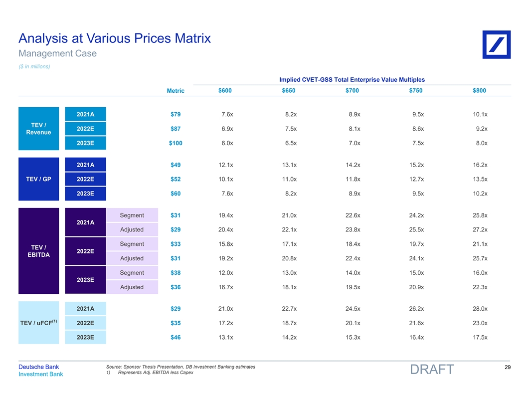 Analysis at Various Prices Matrix Management Case ($ in millions) Implied CVET-GSS Total Enterprise Value Multiples $600 $650 $700 $750 $800 Metric 2021A $79 7.6x 8.2x 8.9x 9.5x 10.1x TEV / 2022E $87 6.9x 7.5x 8.1x 8.6x 9.2x Revenue 2023E $100 6.0x 6.5x 7.0x 7.5x 8.0x 2021A $49 12.1x 13.1x 14.2x 15.2x 16.2x TEV / GP 2022E $52 10.1x 11.0x 11.8x 12.7x 13.5x 2023E $60 7.6x 8.2x 8.9x 9.5x 10.2x Segment $31 19.4x 21.0x 22.6x 24.2x 25.8x 2021A Adjusted $29 20.4x 22.1x 23.8x 25.5x 27.2x Segment $33 15.8x 17.1x 18.4x 19.7x 21.1x TEV / 2022E EBITDA Adjusted $31 19.2x 20.8x 22.4x 24.1x 25.7x Segment $38 12.0x 13.0x 14.0x 15.0x 16.0x 2023E Adjusted $36 16.7x 18.1x 19.5x 20.9x 22.3x 2021A $29 21.0x 22.7x 24.5x 26.2x 28.0x (1) TEV / uFCF 2022E $35 17.2x 18.7x 20.1x 21.6x 23.0x 2023E $46 13.1x 14.2x 15.3x 16.4x 17.5x Source: Sponsor Thesis Presentation, DB Investment Banking estimates Deutsche Bank 29 1) Represents Adj. EBITDA less Capex DRAFT Investment Bank 81nidZpGqzkSDMpD