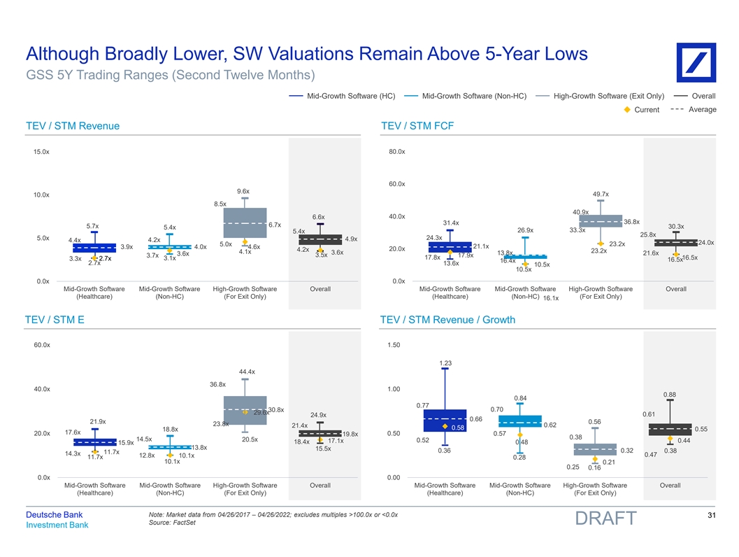Although Broadly Lower, SW Valuations Remain Above 5-Year Lows GSS 5Y Trading Ranges Mid-Growth Software (HC) Mid-Growth Software (Non-HC) High-Growth Software (Exit Only) Overall Average Current TEV / NTM Revenue TEV / NTM FCF 15.0x 80.0x 62.1x 11.3x 60.0x 10.0x 50.5x 10.0x 44.5x 7.4x 7.8x 40.0x 34.9x 35.3x 6.4x 32.7x 5.9x 6.1x 30.7x 36.8x 32.3x 5.5x 25.8x 4.7x 4.5x 5.8x 5.8x 27.6x 5.0x 28.4x 22.9x 25.4x 4.2x 4.3x 4.8x 4.4x 20.1x 18.7x 4.7x 3.9x 20.0x 15.0x 3.9x 20.5x 3.4x 4.0x 3.4x 19.2x 3.6x 17.6x 18.3x 2.9x 14.9x 12.0x 11.8x 0.0x 0.0x Mid-Growth Software Mid-Growth Software High-Growth Software Overall Mid-Growth Software Mid-Growth Software High-Growth Software Overall (Healthcare) (Non-HC) (For Exit Only) (Healthcare) (Non-HC) (For Exit Only) TEV / NTM E TEV / NTM Revenue / Growth 57.9x 60.0x 2.00 1.58 43.6x 1.50 1.24 40.0x 38.2x 1.17 29.3x 0.99 33.0x 1.00 0.90 29.4x 24.6x 24.4x 23.0x 21.6x 0.68 0.71 19.2x 0.74 23.7x 20.0x 21.8x 17.2x 16.0x 17.2x 0.49 0.57 0.58 0.63 0.56 15.5x 0.54 0.50 15.3x 13.5x 15.8x 14.4x 0.41 11.6x 0.43 12.5x 0.39 0.45 11.4x 0.35 0.34 0.27 0.30 0.23 0.18 0.0x 0.00 Mid-Growth Software Mid-Growth Software High-Growth Software Overall Mid-Growth Software Mid-Growth Software High-Growth Software Overall (Healthcare) (Non-HC) (For Exit Only) (Healthcare) (Non-HC) (For Exit Only) Note: Market data from 04/26/2017 – 04/26/2022; excludes multiples >100.0x or <0.0x Deutsche Bank 30 Source: FactSet DRAFT Investment Bank 81nidZpGqzkSDMpD