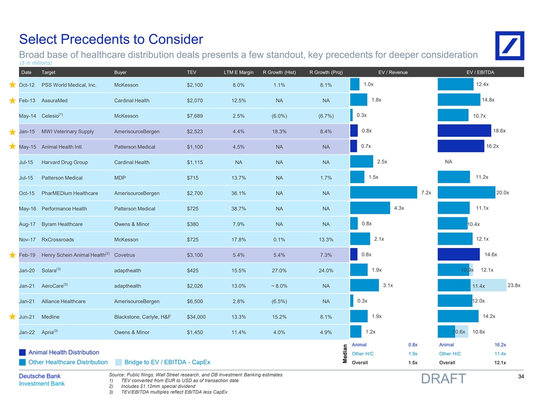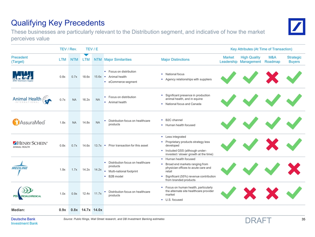Select Precedents to Consider Broad base of healthcare distribution deals presents a few standout, key precedents for deeper consideration ($ in millions) Date Target Buyer TEV LTM E Margin R Growth (Hist) R Growth (Proj) EV / Revenue EV / EBITDA 1.0x 12.4x Oct-12 PSS World Medical, Inc. McKesson $2,100 8.0% 1.1% 8.1% 1.8x 14.8x Feb-13 AssuraMed Cardinal Health $2,070 12.5% NA NA (1) 0.3x May-14 Celesio McKesson $7,689 2.5% (6.0%) (6.7%) 10.7x 0.8x 18.6x Jan-15 MWI Veterinary Supply AmerisourceBergen $2,523 4.4% 18.3% 8.4% 0.7x 16.2x May-15 Animal Health Intl. Patterson Medical $1,100 4.5% NA NA 2.5x NA Jul-15 Harvard Drug Group Cardinal Health $1,115 NA NA NA 1.5x 11.2x Jul-15 Patterson Medical MDP $715 13.7% NA 1.7% 7.2x 20.0x Oct-15 PharMEDium Healthcare AmerisourceBergen $2,700 36.1% NA NA 4.3x 11.1x May-16 Performance Health Patterson Medical $725 38.7% NA NA 0.8x Aug-17 Byram Healthcare Owens & Minor $380 7.9% NA NA 10.4x 2.1x 12.1x Nov-17 RxCrossroads McKesson $725 17.8% 0.1% 13.3% (2) 0.8x 14.6x Feb-19 Henry Schein Animal Health Covetrus $3,100 5.4% 5.4% 7.3% (3) 1.9x 10.9x 12.1x Jan-20 Solara adapthealth $425 15.5% 27.0% 24.0% (3) 3.1x 23.8x Jan-21 AeroCare adapthealth $2,026 13.0% ~ 8.0% NA 11.4x 0.3x 12.0x Jan-21 Alliance Healthcare AmerisourceBergen $6,500 2.8% (6.5%) NA 1.9x 14.2x Jun-21 Medline Blackstone, Carlyle, H&F $34,000 13.3% 15.2% 8.1% (3) 1.2x 10.6x 10.6x Jan-22 Apria Owens & Minor $1,450 11.4% 4.0% 4.9% Animal 0.8x Animal 16.2x Animal Health Distribution Other H/C 1.9x Other H/C 11.4x Other Healthcare Distribution Bridge to EV / EBITDA - CapEx Overall 1.5x Overall 12.1x Source: Public filings, Wall Street research, and DB Investment Banking estimates Deutsche Bank 34 1) TEV converted from EUR to USD as of transaction date DRAFT Investment Bank 2) Includes $1.12mm special dividend 3) TEV/EBITDA multiples reflect EBITDA less CapEx Median 81nidZpGqzkSDMpD