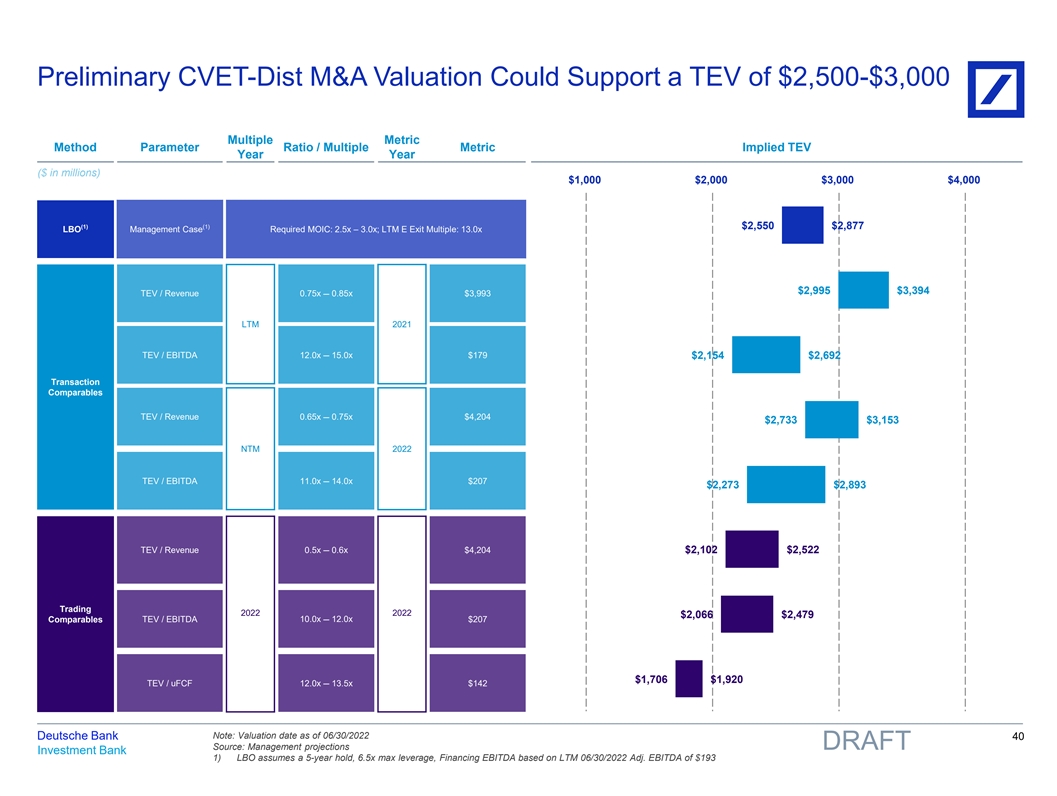 Preliminary CVET-Dist M&A Valuation Could Support a TEV of $2,500-$3,000 Multiple Metric Method Parameter Ratio / Multiple Metric Implied TEV Year Year ($ in millions) $1,000 $2,000 $3,000 $4,000 (1) (1) $2,550 $2,877 LBO Management Case Required MOIC: 2.5x – 3.0x; LTM E Exit Multiple: 13.0x $2,995 $3,394 TEV / Revenue 0.75x 0.85x $3,993 – LTM 2021 TEV / EBITDA 12.0x – 15.0x $179 $2,154 $2,692 Transaction Comparables TEV / Revenue 0.65x – 0.75x $4,204 $2,733 $3,153 NTM 2022 TEV / EBITDA 11.0x 14.0x $207 – $2,273 $2,893 TEV / Revenue 0.5x – 0.6x $4,204 $2,102 $2,522 Trading 2022 2022 $2,066 $2,479 Comparables TEV / EBITDA 10.0x – 12.0x $207 $1,706 $1,920 TEV / uFCF 12.0x – 13.5x $142 Note: Valuation date as of 06/30/2022 Deutsche Bank 40 Source: Management projections DRAFT Investment Bank 1) LBO assumes a 5-year hold, 6.5x max leverage, Financing EBITDA based on LTM 06/30/2022 Adj. EBITDA of $193 81nidZpGqzkSDMpD