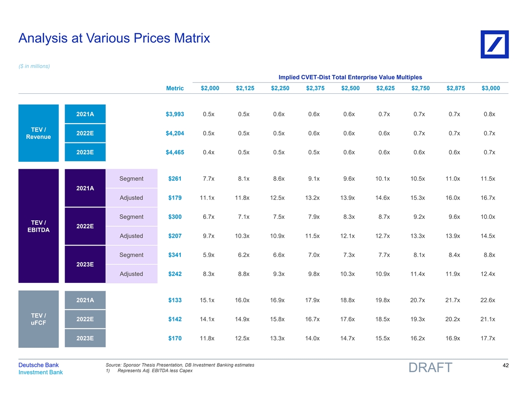 Analysis at Various Prices Matrix ($ in millions) Implied CVET-Dist Total Enterprise Value Multiples $2,000 $2,125 $2,250 $2,375 $2,500 $2,625 $2,750 $2,875 $3,000 Metric 2021A $3,993 0.5x 0.5x 0.6x 0.6x 0.6x 0.7x 0.7x 0.7x 0.8x TEV / 2022E $4,204 0.5x 0.5x 0.5x 0.6x 0.6x 0.6x 0.7x 0.7x 0.7x Revenue 2023E $4,465 0.4x 0.5x 0.5x 0.5x 0.6x 0.6x 0.6x 0.6x 0.7x Segment $261 7.7x 8.1x 8.6x 9.1x 9.6x 10.1x 10.5x 11.0x 11.5x 2021A Adjusted $179 11.1x 11.8x 12.5x 13.2x 13.9x 14.6x 15.3x 16.0x 16.7x Segment $300 6.7x 7.1x 7.5x 7.9x 8.3x 8.7x 9.2x 9.6x 10.0x TEV / 2022E EBITDA Adjusted $207 9.7x 10.3x 10.9x 11.5x 12.1x 12.7x 13.3x 13.9x 14.5x Segment $341 5.9x 6.2x 6.6x 7.0x 7.3x 7.7x 8.1x 8.4x 8.8x 2023E Adjusted $242 8.3x 8.8x 9.3x 9.8x 10.3x 10.9x 11.4x 11.9x 12.4x 2021A $133 15.1x 16.0x 16.9x 17.9x 18.8x 19.8x 20.7x 21.7x 22.6x TEV / 2022E $142 14.1x 14.9x 15.8x 16.7x 17.6x 18.5x 19.3x 20.2x 21.1x uFCF 2023E $170 11.8x 12.5x 13.3x 14.0x 14.7x 15.5x 16.2x 16.9x 17.7x Source: Sponsor Thesis Presentation, DB Investment Banking estimates Deutsche Bank 42 1) Represents Adj. EBITDA less Capex DRAFT Investment Bank 81nidZpGqzkSDMpD