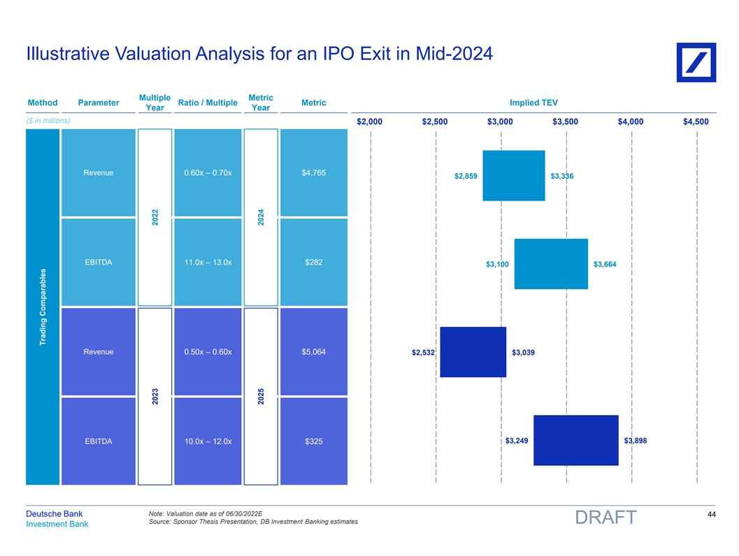 Illustrative Valuation Analysis for an IPO Exit in Mid-2024 Multiple Metric Method Parameter Ratio / Multiple Metric Implied TEV Year Year ($ in millions) $2,000 $2,500 $3,000 $3,500 $4,000 $4,500 Revenue 0.60x – 0.70x $4,765 $2,859 $3,336 EBITDA 11.0x – 13.0x $282 $3,100 $3,664 Revenue 0.50x – 0.60x $5,064 $2,532 $3,039 $3,249 $3,898 EBITDA 10.0x – 12.0x $325 Note: Valuation date as of 06/30/2022E Deutsche Bank 44 Source: Sponsor Thesis Presentation, DB Investment Banking estimates DRAFT Investment Bank Trading Comparables 2023 2022 2025 2024 81nidZpGqzkSDMpD