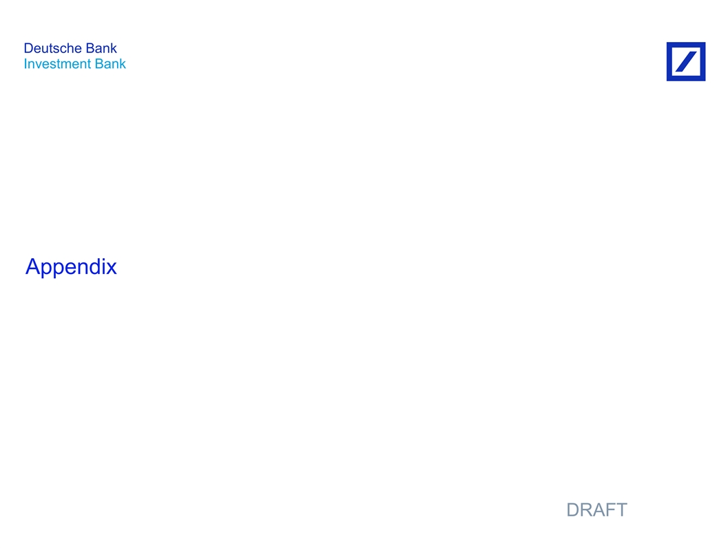 Important Disclosure Information “IMPORTANT: This presentation (the “Presentation”) has been prepared by Deutsche Bank’s investment banking department exclusively for the benefit and internal use of the recipient (the “Recipient”) to whom it is addressed. Neither Deutsche Bank AG New York Branch, Deutsche Bank Trust Company Americas (“DBTCA”) nor any of their banking affiliates is responsible for the obligations of Deutsche Bank Securities Inc. or any U.S. Broker-dealer affiliate. Unless specified otherwise, deposit products are provided by DBTCA, Member FDIC. The Recipient is not permitted to reproduce in whole or in part the information provided in this Presentation (the “Information”) or to communicate the Information to any third party without our prior written consent. No party may rely on this Presentation without our prior written consent. Deutsche Bank and its affiliates, officers, directors, employees and agents do not accept responsibility or liability for this Presentation or its contents (except to the extent that such liability cannot be excluded by law). This Presentation is (i) for discussion purposes only; and (ii) speaks only as of the date it is given, reflecting prevailing market conditions and the views expressed are subject to change based upon a number of factors, including market conditions and the Recipient's business and prospects. The Information, whether taken from public sources, received from the Recipient or elsewhere, has not been verified and Deutsche Bank has relied upon and assumed without independent verification, the accuracy and completeness of all information which may have been provided directly or indirectly by the Recipient. No representation or warranty is made as to the Information’s accuracy or completeness and Deutsche Bank assumes no obligation to update the Information. The Presentation is incomplete without reference to, and should be viewed solely in conjunction with, the oral briefing provided by Deutsche Bank. The analyses contained in the Presentation are not, and do not purport to be, appraisals of the assets, stock, or business of the Recipient. The Information does not take into account the effects of a possible transaction or transactions involving an actual or potential change of control, which may have significant valuation and other effects. The Presentation is not exhaustive and does not serve as legal, accounting, tax, investment or any other kind of advice. This Presentation is not intended to provide, and must not be taken as, the basis of any decision and should not be considered as a recommendation by Deutsche Bank. Recipient must make its own independent assessment and such investigations as it deems necessary. In preparing this presentation Deutsche Bank has acted as an independent contractor and nothing in this presentation is intended to create or shall be construed as creating a fiduciary or other relationship between the Recipient and Deutsche Bank.” Deutsche Bank DRAFT Investment Bank 81nidZpGqzkSDMpD