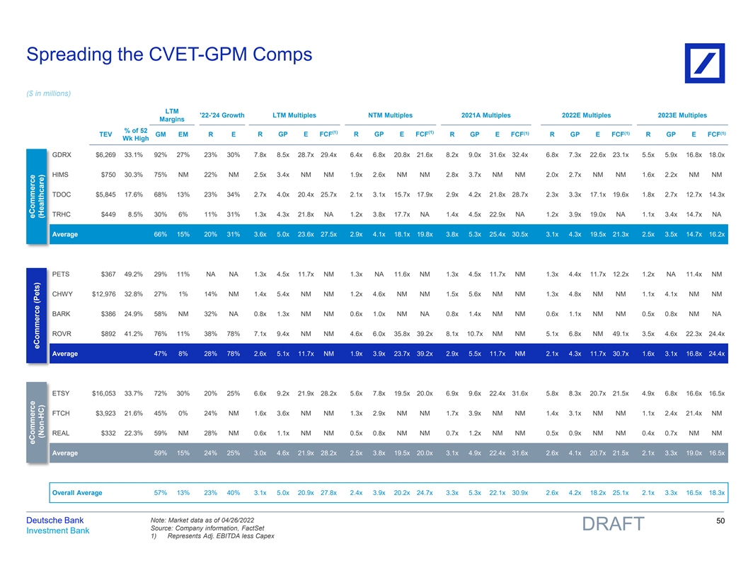 Spreading the CVET-GPM Comps ($ in millions) LTM '22-'24 Growth LTM Multiples NTM Multiples 2021A Multiples 2022E Multiples 2023E Multiples Margins % of 52 (1) (1) (1) (1) (1) TEV GM EM R E R GP E FCF R GP E FCF R GP E FCF R GP E FCF R GP E FCF Wk High GDRX $6,269 33.1% 92% 27% 23% 30% 7.8x 8.5x 28.7x 29.4x 6.4x 6.8x 20.8x 21.6x 8.2x 9.0x 31.6x 32.4x 6.8x 7.3x 22.6x 23.1x 5.5x 5.9x 16.8x 18.0x HIMS $750 30.3% 75% NM 22% NM 2.5x 3.4x NM NM 1.9x 2.6x NM NM 2.8x 3.7x NM NM 2.0x 2.7x NM NM 1.6x 2.2x NM NM TDOC $5,845 17.6% 68% 13% 23% 34% 2.7x 4.0x 20.4x 25.7x 2.1x 3.1x 15.7x 17.9x 2.9x 4.2x 21.8x 28.7x 2.3x 3.3x 17.1x 19.6x 1.8x 2.7x 12.7x 14.3x TRHC $449 8.5% 30% 6% 11% 31% 1.3x 4.3x 21.8x NA 1.2x 3.8x 17.7x NA 1.4x 4.5x 22.9x NA 1.2x 3.9x 19.0x NA 1.1x 3.4x 14.7x NA Average 66% 15% 20% 31% 3.6x 5.0x 23.6x 27.5x 2.9x 4.1x 18.1x 19.8x 3.8x 5.3x 25.4x 30.5x 3.1x 4.3x 19.5x 21.3x 2.5x 3.5x 14.7x 16.2x PETS $367 49.2% 29% 11% NA NA 1.3x 4.5x 11.7x NM 1.3x NA 11.6x NM 1.3x 4.5x 11.7x NM 1.3x 4.4x 11.7x 12.2x 1.2x NA 11.4x NM CHWY $12,976 32.8% 27% 1% 14% NM 1.4x 5.4x NM NM 1.2x 4.6x NM NM 1.5x 5.6x NM NM 1.3x 4.8x NM NM 1.1x 4.1x NM NM BARK $386 24.9% 58% NM 32% NA 0.8x 1.3x NM NM 0.6x 1.0x NM NA 0.8x 1.4x NM NM 0.6x 1.1x NM NM 0.5x 0.8x NM NA ROVR $892 41.2% 76% 11% 38% 78% 7.1x 9.4x NM NM 4.6x 6.0x 35.8x 39.2x 8.1x 10.7x NM NM 5.1x 6.8x NM 49.1x 3.5x 4.6x 22.3x 24.4x Average 47% 8% 28% 78% 2.6x 5.1x 11.7x NM 1.9x 3.9x 23.7x 39.2x 2.9x 5.5x 11.7x NM 2.1x 4.3x 11.7x 30.7x 1.6x 3.1x 16.8x 24.4x ETSY $16,053 33.7% 72% 30% 20% 25% 6.6x 9.2x 21.9x 28.2x 5.6x 7.8x 19.5x 20.0x 6.9x 9.6x 22.4x 31.6x 5.8x 8.3x 20.7x 21.5x 4.9x 6.8x 16.6x 16.5x FTCH $3,923 21.6% 45% 0% 24% NM 1.6x 3.6x NM NM 1.3x 2.9x NM NM 1.7x 3.9x NM NM 1.4x 3.1x NM NM 1.1x 2.4x 21.4x NM REAL $332 22.3% 59% NM 28% NM 0.6x 1.1x NM NM 0.5x 0.8x NM NM 0.7x 1.2x NM NM 0.5x 0.9x NM NM 0.4x 0.7x NM NM Average 59% 15% 24% 25% 3.0x 4.6x 21.9x 28.2x 2.5x 3.8x 19.5x 20.0x 3.1x 4.9x 22.4x 31.6x 2.6x 4.1x 20.7x 21.5x 2.1x 3.3x 19.0x 16.5x Overall Average 57% 13% 23% 40% 3.1x 5.0x 20.9x 27.8x 2.4x 3.9x 20.2x 24.7x 3.3x 5.3x 22.1x 30.9x 2.6x 4.2x 18.2x 25.1x 2.1x 3.3x 16.5x 18.3x Note: Market data as of 04/26/2022 Deutsche Bank 50 Source: Company information, FactSet DRAFT Investment Bank 1) Represents Adj. EBITDA less Capex eCommerce eCommerce eCommerce (Pets) (Non-HC) (Healthcare) 81nidZpGqzkSDMpD
