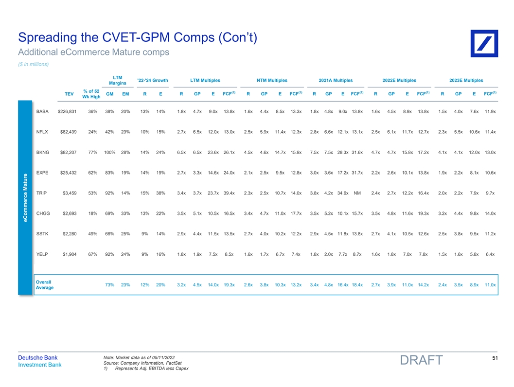 Spreading the CVET-GPM Comps (Con’t) Additional eCommerce Mature comps ($ in millions) LTM '22-'24 Growth LTM Multiples NTM Multiples 2021A Multiples 2022E Multiples 2023E Multiples Margins % of 52 (1) (1) (1) (1) (1) TEV GM EM R E R GP E FCF R GP E FCF R GP E FCF R GP E FCF R GP E FCF Wk High BABA $226,831 36% 38% 20% 13% 14% 1.8x 4.7x 9.0x 13.8x 1.6x 4.4x 8.5x 13.3x 1.8x 4.8x 9.0x 13.8x 1.6x 4.5x 8.9x 13.8x 1.5x 4.0x 7.6x 11.9x NFLX $82,439 24% 42% 23% 10% 15% 2.7x 6.5x 12.0x 13.0x 2.5x 5.9x 11.4x 12.3x 2.8x 6.6x 12.1x 13.1x 2.5x 6.1x 11.7x 12.7x 2.3x 5.5x 10.6x 11.4x BKNG $82,207 77% 100% 28% 14% 24% 6.5x 6.5x 23.6x 26.1x 4.5x 4.6x 14.7x 15.9x 7.5x 7.5x 28.3x 31.6x 4.7x 4.7x 15.8x 17.2x 4.1x 4.1x 12.0x 13.0x EXPE $25,432 62% 83% 19% 14% 19% 2.7x 3.3x 14.6x 24.0x 2.1x 2.5x 9.5x 12.8x 3.0x 3.6x 17.2x 31.7x 2.2x 2.6x 10.1x 13.8x 1.9x 2.2x 8.1x 10.6x TRIP $3,459 53% 92% 14% 15% 38% 3.4x 3.7x 23.7x 39.4x 2.3x 2.5x 10.7x 14.0x 3.8x 4.2x 34.6x NM 2.4x 2.7x 12.2x 16.4x 2.0x 2.2x 7.9x 9.7x CHGG $2,693 18% 69% 33% 13% 22% 3.5x 5.1x 10.5x 16.5x 3.4x 4.7x 11.0x 17.7x 3.5x 5.2x 10.1x 15.7x 3.5x 4.8x 11.6x 19.3x 3.2x 4.4x 9.8x 14.0x SSTK $2,280 49% 66% 25% 9% 14% 2.9x 4.4x 11.5x 13.5x 2.7x 4.0x 10.2x 12.2x 2.9x 4.5x 11.8x 13.8x 2.7x 4.1x 10.5x 12.6x 2.5x 3.8x 9.5x 11.2x YELP $1,904 67% 92% 24% 9% 16% 1.8x 1.9x 7.5x 8.5x 1.6x 1.7x 6.7x 7.4x 1.8x 2.0x 7.7x 8.7x 1.6x 1.8x 7.0x 7.8x 1.5x 1.6x 5.8x 6.4x Overall 73% 23% 12% 20% 3.2x 4.5x 14.0x 19.3x 2.6x 3.8x 10.3x 13.2x 3.4x 4.8x 16.4x 18.4x 2.7x 3.9x 11.0x 14.2x 2.4x 3.5x 8.9x 11.0x Average Note: Market data as of 05/11/2022 Deutsche Bank 51 Source: Company information, FactSet DRAFT Investment Bank 1) Represents Adj. EBITDA less Capex eCommerce Mature 81nidZpGqzkSDMpD