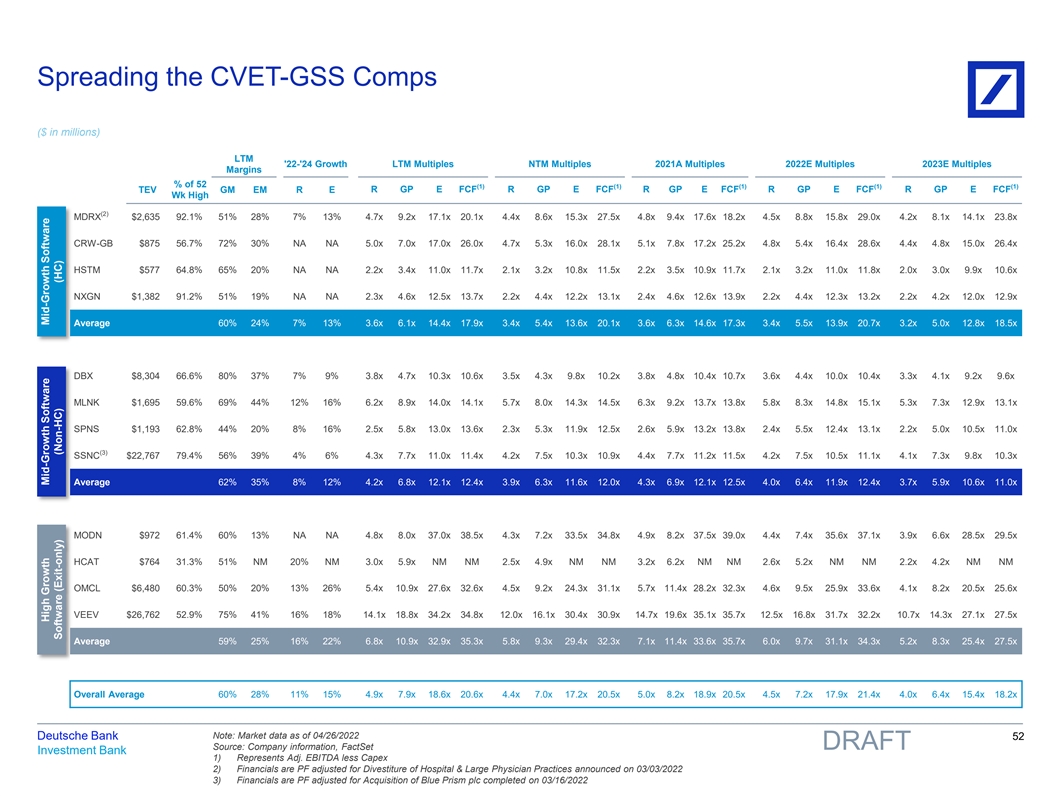 Spreading the CVET-GSS Comps ($ in millions) LTM '22-'24 Growth LTM Multiples NTM Multiples 2021A Multiples 2022E Multiples 2023E Multiples Margins % of 52 (1) (1) (1) (1) (1) R GP E FCF R GP E FCF R GP E FCF R GP E FCF R GP E FCF TEV GM EM R E Wk High (2) MDRX $2,635 92.1% 51% 28% 7% 13% 4.7x 9.2x 17.1x 20.1x 4.4x 8.6x 15.3x 27.5x 4.8x 9.4x 17.6x 18.2x 4.5x 8.8x 15.8x 29.0x 4.2x 8.1x 14.1x 23.8x CRW-GB $875 56.7% 72% 30% NA NA 5.0x 7.0x 17.0x 26.0x 4.7x 5.3x 16.0x 28.1x 5.1x 7.8x 17.2x 25.2x 4.8x 5.4x 16.4x 28.6x 4.4x 4.8x 15.0x 26.4x HSTM $577 64.8% 65% 20% NA NA 2.2x 3.4x 11.0x 11.7x 2.1x 3.2x 10.8x 11.5x 2.2x 3.5x 10.9x 11.7x 2.1x 3.2x 11.0x 11.8x 2.0x 3.0x 9.9x 10.6x NXGN $1,382 91.2% 51% 19% NA NA 2.3x 4.6x 12.5x 13.7x 2.2x 4.4x 12.2x 13.1x 2.4x 4.6x 12.6x 13.9x 2.2x 4.4x 12.3x 13.2x 2.2x 4.2x 12.0x 12.9x Average 60% 24% 7% 13% 3.6x 6.1x 14.4x 17.9x 3.4x 5.4x 13.6x 20.1x 3.6x 6.3x 14.6x 17.3x 3.4x 5.5x 13.9x 20.7x 3.2x 5.0x 12.8x 18.5x DBX $8,304 66.6% 80% 37% 7% 9% 3.8x 4.7x 10.3x 10.6x 3.5x 4.3x 9.8x 10.2x 3.8x 4.8x 10.4x 10.7x 3.6x 4.4x 10.0x 10.4x 3.3x 4.1x 9.2x 9.6x MLNK $1,695 59.6% 69% 44% 12% 16% 6.2x 8.9x 14.0x 14.1x 5.7x 8.0x 14.3x 14.5x 6.3x 9.2x 13.7x 13.8x 5.8x 8.3x 14.8x 15.1x 5.3x 7.3x 12.9x 13.1x SPNS $1,193 62.8% 44% 20% 8% 16% 2.5x 5.8x 13.0x 13.6x 2.3x 5.3x 11.9x 12.5x 2.6x 5.9x 13.2x 13.8x 2.4x 5.5x 12.4x 13.1x 2.2x 5.0x 10.5x 11.0x (3) SSNC $22,767 79.4% 56% 39% 4% 6% 4.3x 7.7x 11.0x 11.4x 4.2x 7.5x 10.3x 10.9x 4.4x 7.7x 11.2x 11.5x 4.2x 7.5x 10.5x 11.1x 4.1x 7.3x 9.8x 10.3x Average 62% 35% 8% 12% 4.2x 6.8x 12.1x 12.4x 3.9x 6.3x 11.6x 12.0x 4.3x 6.9x 12.1x 12.5x 4.0x 6.4x 11.9x 12.4x 3.7x 5.9x 10.6x 11.0x MODN $972 61.4% 60% 13% NA NA 4.8x 8.0x 37.0x 38.5x 4.3x 7.2x 33.5x 34.8x 4.9x 8.2x 37.5x 39.0x 4.4x 7.4x 35.6x 37.1x 3.9x 6.6x 28.5x 29.5x HCAT $764 31.3% 51% NM 20% NM 3.0x 5.9x NM NM 2.5x 4.9x NM NM 3.2x 6.2x NM NM 2.6x 5.2x NM NM 2.2x 4.2x NM NM OMCL $6,480 60.3% 50% 20% 13% 26% 5.4x 10.9x 27.6x 32.6x 4.5x 9.2x 24.3x 31.1x 5.7x 11.4x 28.2x 32.3x 4.6x 9.5x 25.9x 33.6x 4.1x 8.2x 20.5x 25.6x VEEV $26,762 52.9% 75% 41% 16% 18% 14.1x 18.8x 34.2x 34.8x 12.0x 16.1x 30.4x 30.9x 14.7x 19.6x 35.1x 35.7x 12.5x 16.8x 31.7x 32.2x 10.7x 14.3x 27.1x 27.5x Average 59% 25% 16% 22% 6.8x 10.9x 32.9x 35.3x 5.8x 9.3x 29.4x 32.3x 7.1x 11.4x 33.6x 35.7x 6.0x 9.7x 31.1x 34.3x 5.2x 8.3x 25.4x 27.5x Overall Average 60% 28% 11% 15% 4.9x 7.9x 18.6x 20.6x 4.4x 7.0x 17.2x 20.5x 5.0x 8.2x 18.9x 20.5x 4.5x 7.2x 17.9x 21.4x 4.0x 6.4x 15.4x 18.2x Note: Market data as of 04/26/2022 Deutsche Bank 52 Source: Company information, FactSet DRAFT Investment Bank 1) Represents Adj. EBITDA less Capex 2) Financials are PF adjusted for Divestiture of Hospital & Large Physician Practices announced on 03/03/2022 3) Financials are PF adjusted for Acquisition of Blue Prism plc completed on 03/16/2022 High Growth Mid-Growth Software Mid-Growth Software Software (Exit-only) (Non-HC) (HC) 81nidZpGqzkSDMpD