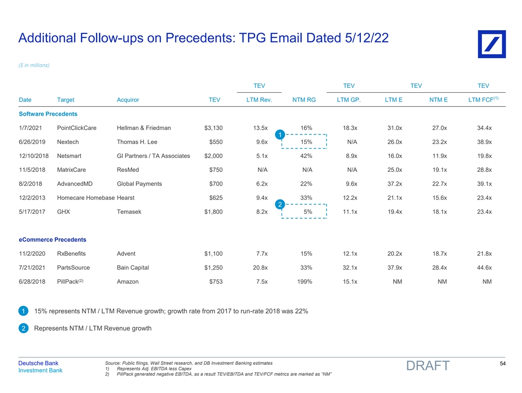 Additional Follow-ups on Precedents: TPG Email Dated 5/12/22 ($ in millions) TEV TEV TEV TEV (1) Date Target Acquiror TEV LTM Rev. NTM RG LTM GP. LTM E NTM E LTM FCF Software Precedents 1/7/2021 PointClickCare Hellman & Friedman $3,130 13.5x 16% 18.3x 31.0x 27.0x 34.4x 1 6/26/2019 Nextech Thomas H. Lee $550 9.6x 15% N/A 26.0x 23.2x 38.9x 12/10/2018 Netsmart GI Partners / TA Associates $2,000 5.1x 42% 8.9x 16.0x 11.9x 19.8x 11/5/2018 MatrixCare ResMed $750 N/A N/A N/A 25.0x 19.1x 28.8x 8/2/2018 AdvancedMD Global Payments $700 6.2x 22% 9.6x 37.2x 22.7x 39.1x 12/2/2013 Homecare Homebase Hearst $625 9.4x 33% 12.2x 21.1x 15.6x 23.4x 2 5/17/2017 GHX Temasek $1,800 8.2x 5% 11.1x 19.4x 18.1x 23.4x eCommerce Precedents 11/2/2020 RxBenefits Advent $1,100 7.7x 15% 12.1x 20.2x 18.7x 21.8x 7/21/2021 PartsSource Bain Capital $1,250 20.8x 33% 32.1x 37.9x 28.4x 44.6x (2) 6/28/2018 PillPack Amazon $753 7.5x 199% 15.1x NM NM NM 1 15% represents NTM / LTM Revenue growth; growth rate from 2017 to run-rate 2018 was 22% 2 Represents NTM / LTM Revenue growth Source: Public filings, Wall Street research, and DB Investment Banking estimates Deutsche Bank 54 1) Represents Adj. EBITDA less Capex DRAFT Investment Bank 2) PillPack generated negative EBITDA, as a result TEV/EBITDA and TEV/FCF metrics are marked as “NM” 81nidZpGqzkSDMpD