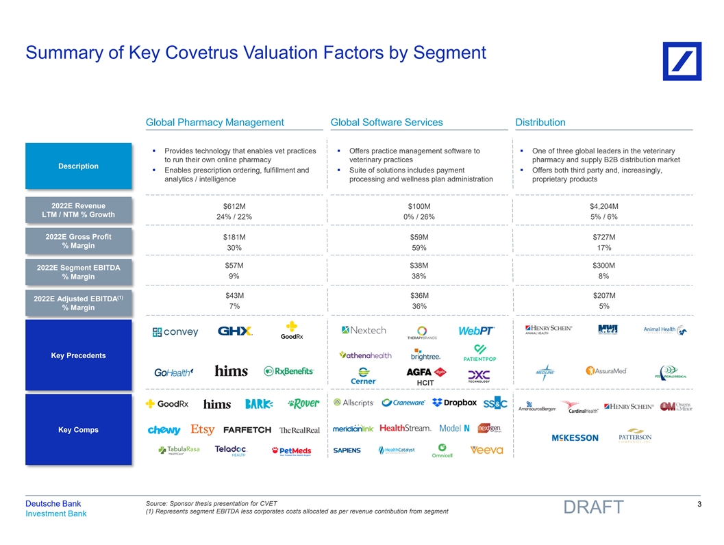 Executive Summary ▪ Ostensibly, there are three distinct CVET divisions – Distribution, GPM and GSS – favoring not only a sum-of-the-parts analysis, but also some consideration to separating the businesses in order to pursue divergent M&A and exit strategies in order to maximize shareholder value in the future – GPM’s closest eCommerce & Marketplace precedents and comps have recently traded as high as 10x revenue (or more), but are now trending in the 1.5-2.5x revenue range (or, 3-5x gross profit and 16-18x EBITDA); given GPM growth and market position, the business would command a top-of-the-range multiple on a standalone basis – If GSS can deliver on its 2022 forecast – +20% growth and ~40% EBITDA margins – the business would be a “”blue moon” software asset and could command a multiple similar to recent deals such as GHX, TherapyBrands and WebPT, suggesting an approximate $1B TEV, otherwise reality is consistently more akin to 12-14x EBITDA ▪ However, consideration must be given to the impact of any separation on the remainco profile and exit alternatives – Distribution & GPM feels more closely linked than either is with GSS – GSS & GPM are the primary drivers of growth and margin; a separation of both would put greater emphasis on executing the proprietary brand strategy within distribution – We do believe there will be strategic interest in a standalone distribution platform given market leadership in an attractive, growthy segment – Execution risk is somewhat mitigated by an entry price that most closely aligns to distribution peers Source: Company data Deutsche Bank 1 DRAFT Investment Bank 81nidZpGqzkSDMpD