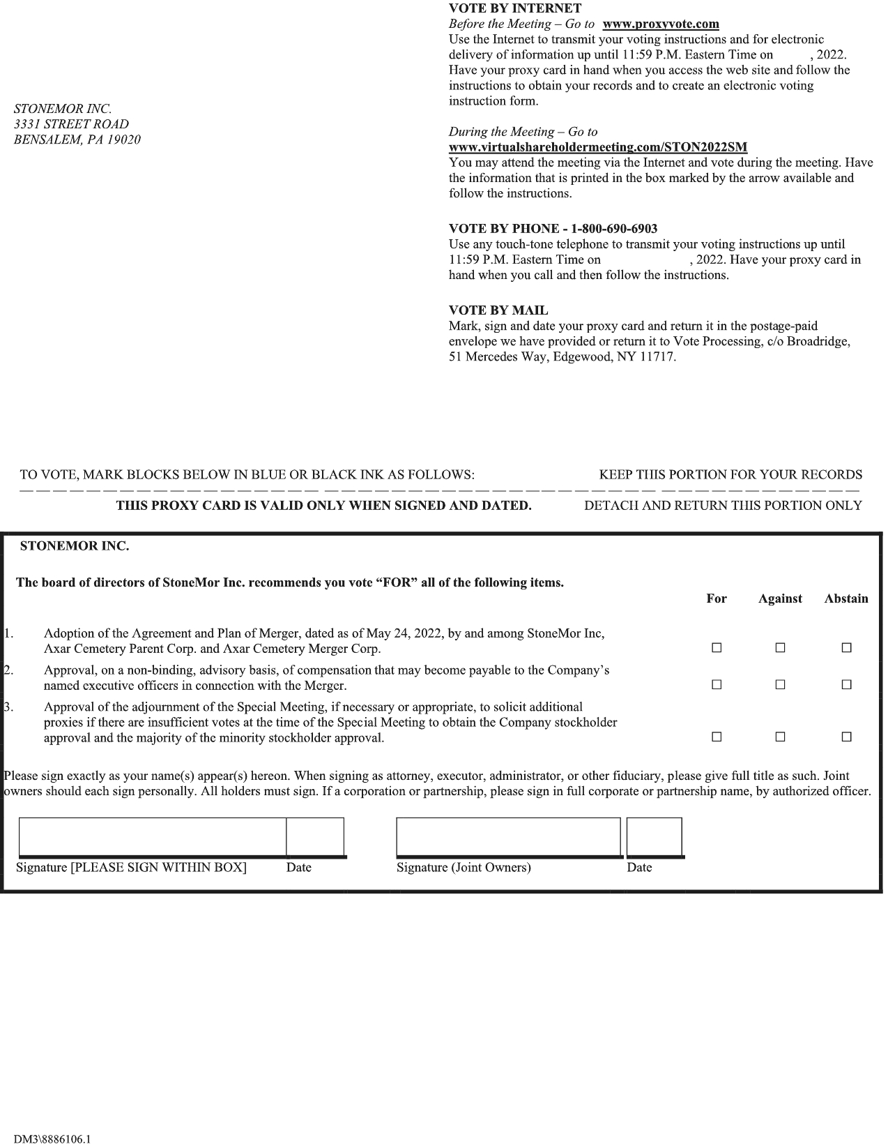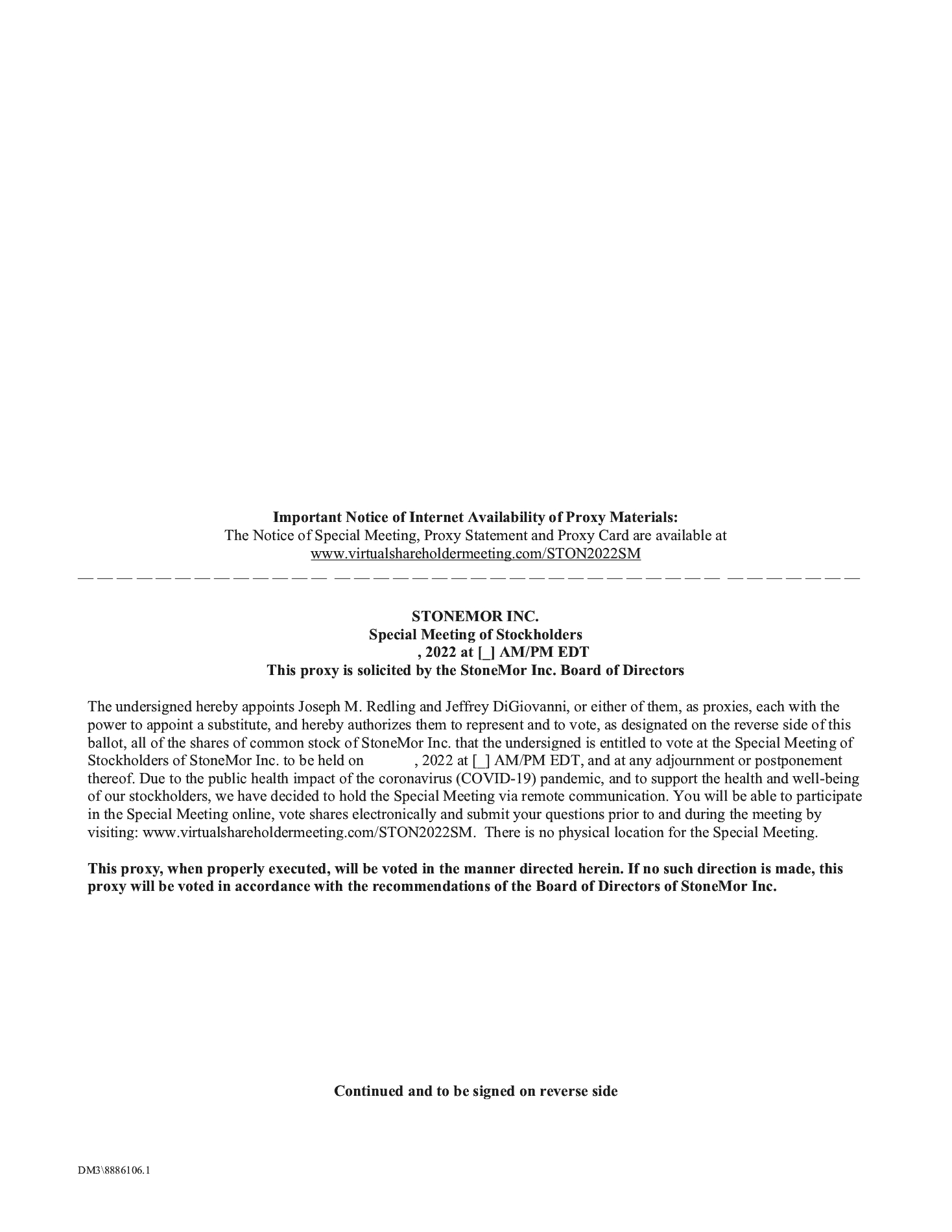 You are cordially invited to attend a special meeting (the “Special Meeting”) of the stockholders of StoneMor Inc. (the “Company”). The Special Meeting will be held at [] [a.m./p.m.], Eastern time, on    , 2022. You will be able to attend the Special Meeting, vote, and submit your questions during the Special Meeting via live webcast by visiting www.virtualshareholdermeeting.com/STON2022SM. To attend the Special Meeting via live webcast, you must have your sixteen-digit control number that is shown on the proxy card accompanying the enclosed proxy statement. You will not be able to attend the Special Meeting in person. Formal notice of the Special Meeting, a proxy statement, and a proxy card and voting instruction card accompany this letter.
