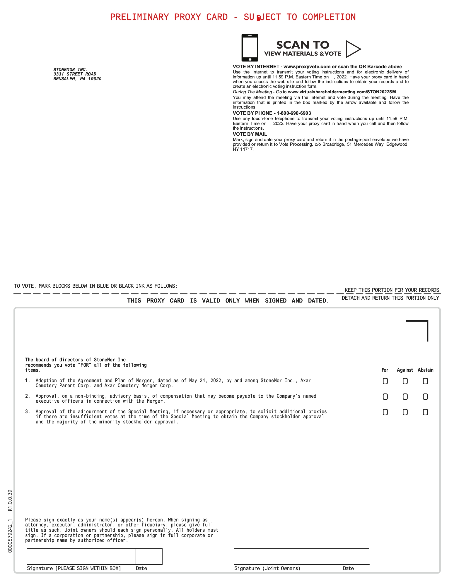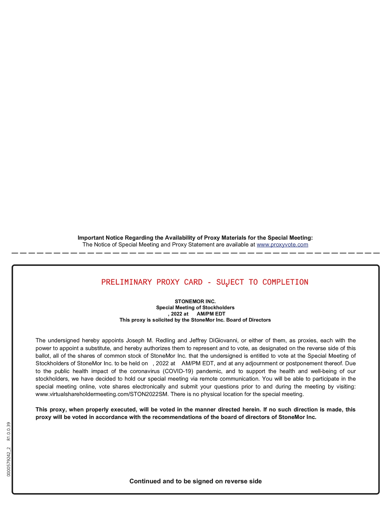 You are cordially invited to attend a special meeting (the “Special Meeting”) of the stockholders of StoneMor Inc. (the “Company”). The Special Meeting will be held at [] [a.m./p.m.], Eastern time, on    , 2022. You will be able to attend the Special Meeting, vote, and submit your questions during the Special Meeting via live webcast by visiting www.virtualshareholdermeeting.com/STON2022SM. To attend the Special Meeting via live webcast, you must have your sixteen-digit control number that is shown on the proxy card accompanying the enclosed proxy statement. You will not be able to attend the Special Meeting in person. Formal notice of the Special Meeting, a proxy statement, and a proxy card and voting instruction card accompany this letter.