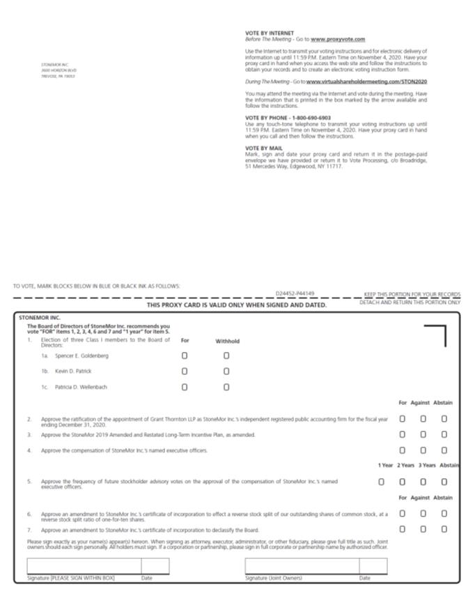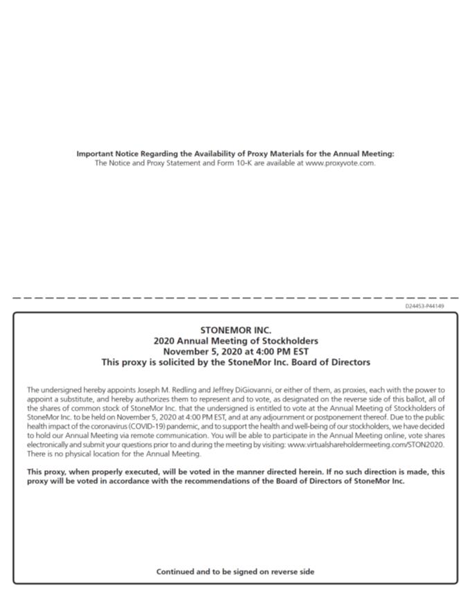 Important Notice Regarding the Availability of Proxy Materials for the Annual Meeting: The Notice and Proxy Statement and Form 10-K are available at www.proxyvote.com. D24453-P44149 STONEMOR INC. 2020 Annual Meeting of Stockholders November 5, 2020 at 4:00 PM EST This proxy is solicited by the StoneMor Inc. Board of Directors The undersigned hereby appoints Joseph M. Redling and Jeffrey DiGiovanni, or either of them, as proxies, each with the power to appoint a substitute, and hereby authorizes them to represent and to vote, as designated on the reverse side of this ballot, all of the shares of common stock of StoneMor Inc. that the undersigned is entitled to vote at the Annual Meeting of Stockholders of StoneMor Inc. to be held on November 5, 2020 at 4:00 PM EST, and at any adjournment or postponement thereof. Due to the public health impact of the coronavirus (COVID-19) pandemic, and to support the health and well-being of our stockholders, we have decided to hold our Annual Meeting via remote communication. You will be able to participate in the Annual Meeting online, vote shares electronically and submit your questions prior to and during the meeting by visiting: www.virtualshareholdermeeting.com/STON2020. There is no physical location for the Annual Meeting. This proxy, when properly executed, will be voted in the manner directed herein. If no such direction is made, this proxy will be voted in accordance with the recommendations of the Board of Directors of StoneMor Inc. Continued and to be signed on reverse side