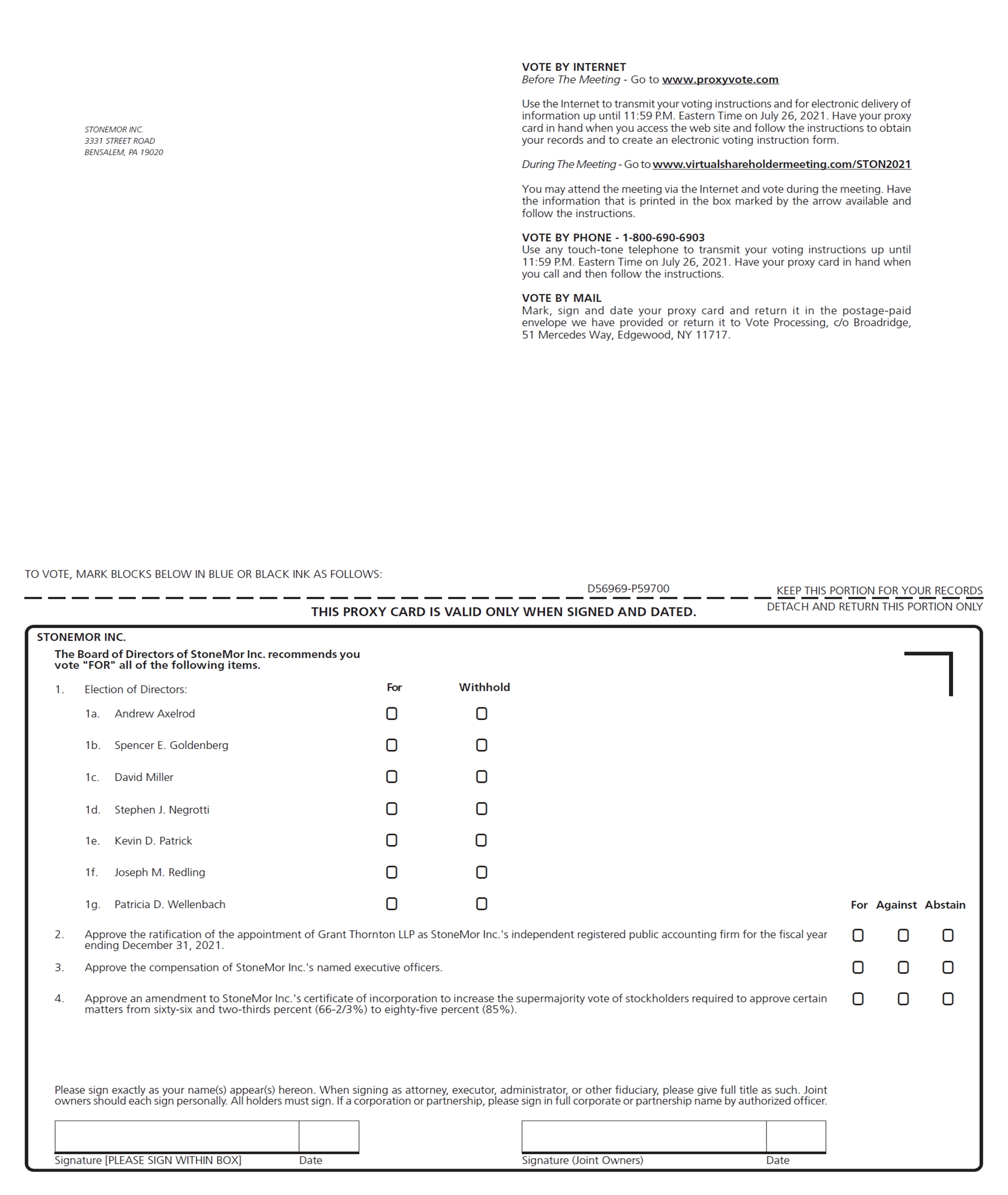 VOTE BY INTERNET Before The Meeting - Go to www.proxyvote.com Use the Internet to transmit your voting instructions and for electronic delivery of information up until 11:59 P.M. Eastern Time on July 26, 2021. Have your proxy card in hand when you access the web site and follow the instructions to obtain your records and to create an electronic voting instruction form. During The Meeting - Go to www.virtualshareholdermeeting.com/STON2021 You may attend the meeting via the Internet and vote during the meeting. Have the information that is printed in the box marked by the arrow available and follow the instructions. VOTE BY PHONE - 1-800-690-6903 Use any touch-tone telephone to transmit your voting instructions up until 11:59 P.M. Eastern Time on July 26, 2021. Have your proxy card in hand when you call and then follow the instructions. VOTE BY MAIL Mark, sign and date your proxy card and return it in the postage-paid envelope we have provided or return it to Vote Processing, c/o Broadridge, 51 Mercedes Way, Edgewood, NY 11717. STONEMOR INC. 3331 STREET ROAD BENSALEM, PA 19020 D56969-P59700 STONEMOR INC. The Board of Directors of StoneMor Inc. recommends you vote "FOR" all of the following items. For Withhold 1. Election of Directors: ! ! 1a. Andrew Axelrod ! ! 1b. Spencer E. Goldenberg ! ! 1c. David Miller ! ! 1d. Stephen J. Negrotti ! ! 1e. Kevin D. Patrick ! ! 1f. Joseph M. Redling ! ! 1g. Patricia D. Wellenbach Abstain Against For ! ! ! 2. Approve the ratification of the appointment of Grant Thornton LLP as StoneMor Inc.'s independent registered public accounting firm for the fiscal year ending December 31, 2021. ! ! ! 3. Approve the compensation of StoneMor Inc.'s named executive officers. ! ! ! 4. Approve an amendment to StoneMor Inc.'s certificate of incorporation to increase the supermajority vote of stockholders required to approve certain matters from sixty-six and two-thirds percent (66-2/3%) to eighty-five percent (85%). Please sign exactly as your name(s) appear(s) hereon. When signing as attorney, executor, administrator, or other fiduciary, please give full title as such. Joint owners should each sign personally. All holders must sign. If a corporation or partnership, please sign in full corporate or partnership name by authorized officer. Important Notice Regarding the Availability of Proxy Materials for the Annual Meeting: The Notice of Annual Meeting, Proxy Statement, Form 10-K and Proxy Card are available at www.proxyvote.com. D56970-P59700 STONEMOR INC. 2021 Annual Meeting of Stockholders July 27, 2021 at 4:00 PM EDT This proxy is solicited by the StoneMor Inc. Board of Directors The undersigned hereby appoints Joseph M. Redling and Jeffrey DiGiovanni, or either of them, as proxies, each with the power to appoint a substitute, and hereby authorizes them to represent and to vote, as designated on the reverse side of this ballot, all of the shares of common stock of StoneMor Inc. that the undersigned is entitled to vote at the Annual Meeting of Stockholders of StoneMor Inc. to be held on July 27, 2021 at 4:00 PM EDT, and at any adjournment or postponement thereof. Due to the public health impact of the coronavirus (COVID-19) pandemic, and to support the health and well-being of our stockholders, we have decided to hold our annual meeting via remote communication. You will be able to participate in the annual meeting online, vote shares electronically and submit your questions prior to and during the meeting by visiting: www.virtualshareholdermeeting.com/STON2021. There is no physical location for the annual meeting. This proxy, when properly executed, will be voted in the manner directed herein. If no such direction is made, this proxy will be voted in accordance with the recommendations of the Board of Directors of StoneMor Inc. Continued and to be signed on reverse side