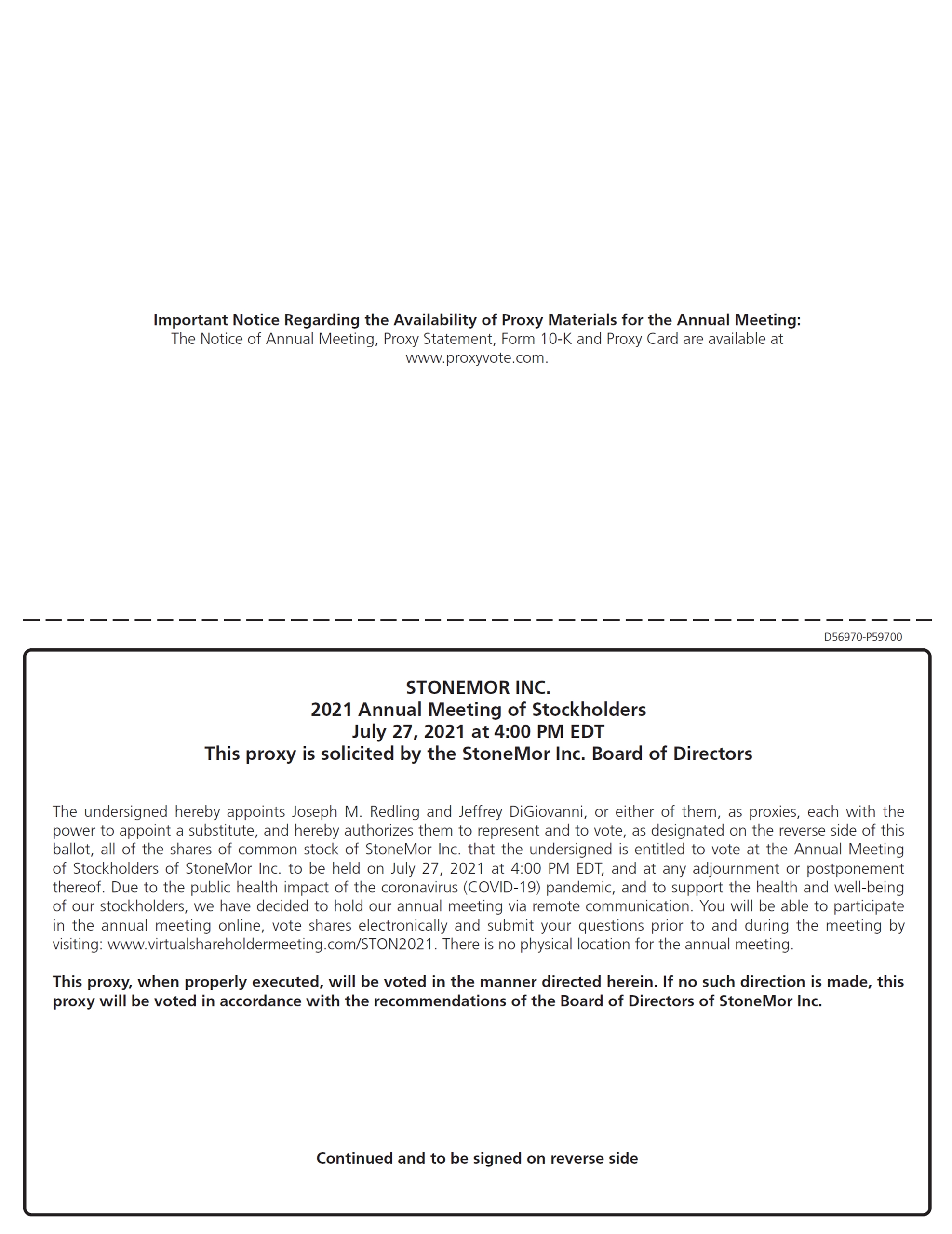 StoneMor is furnishing this proxy statement to our stockholders in connection with the solicitation by our board of directors (the “Board”) of proxies for the 2021 annual meeting of stockholders we are holding on Tuesday, July 27, 2021, at 4:00 p.m., Eastern Daylight Time (the “Annual Meeting”), or for any adjournment(s) of that meeting. The Annual Meeting will be held solely virtually via live webcast at www.virtualshareholdermeeting.com/STON2021.