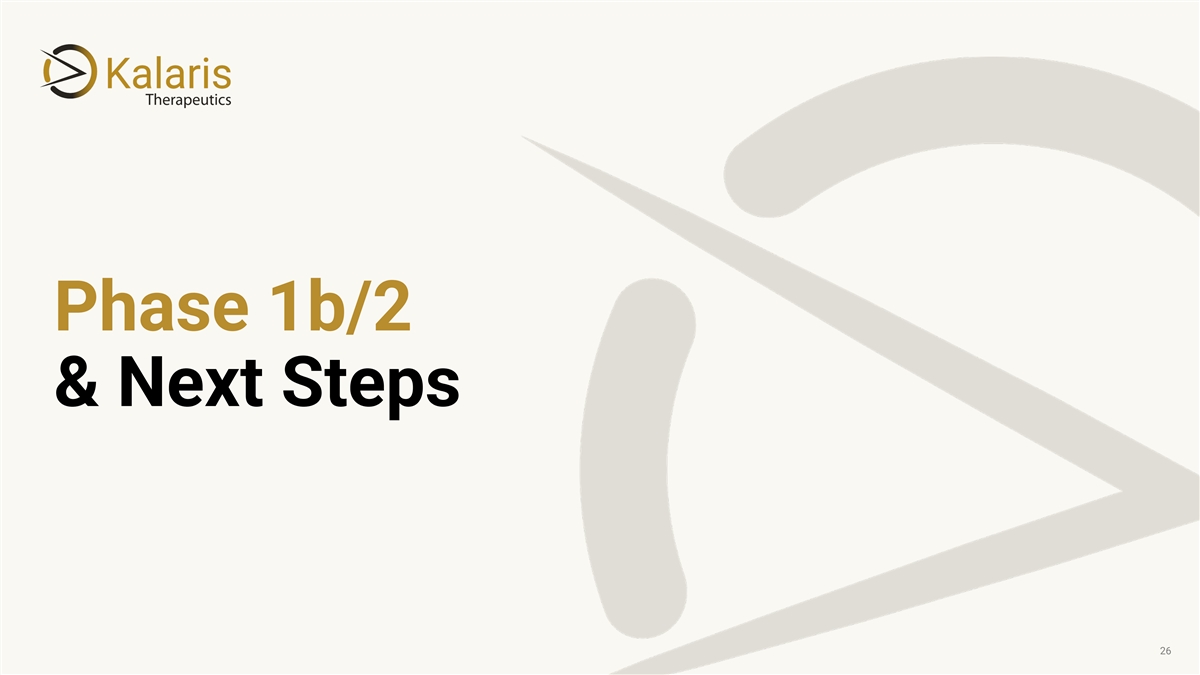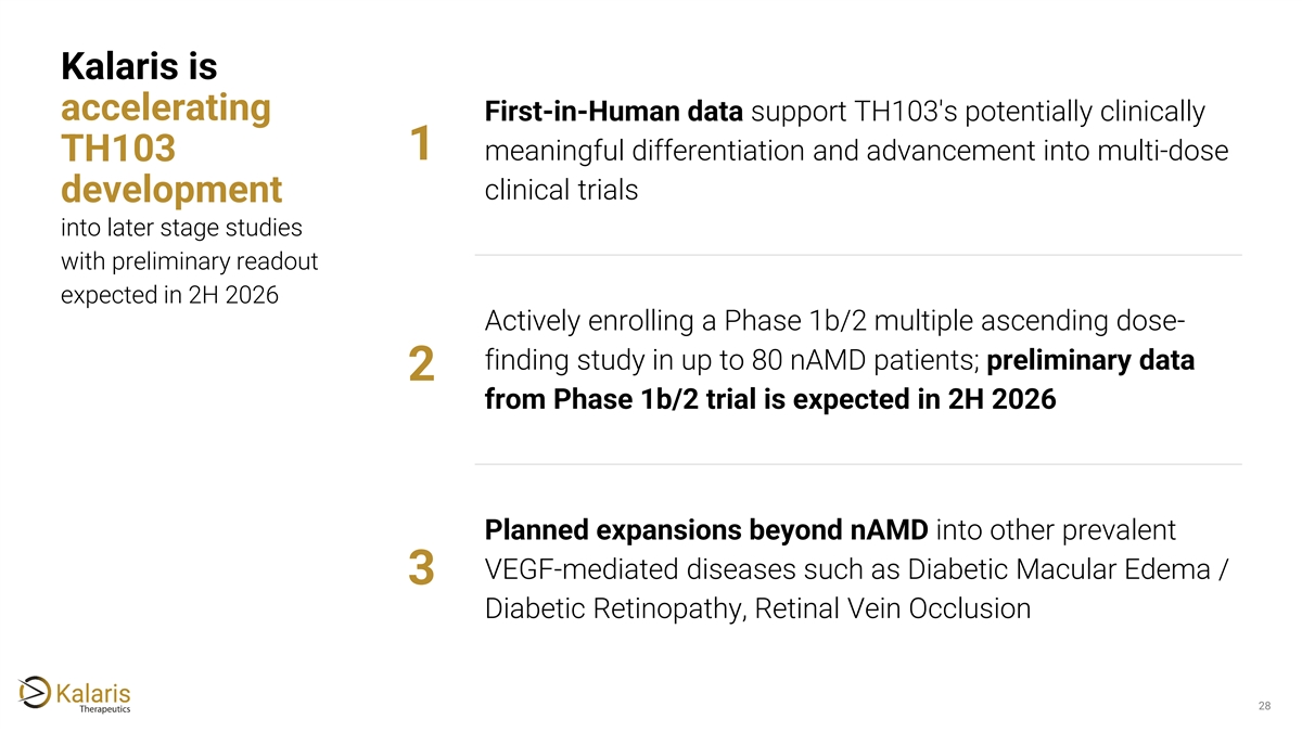 Kalaris is accelerating First-in-Human data support TH103's potentially clinically 1 meaningful differentiation and advancement into multi-dose TH103 clinical trials development into later stage studies with preliminary readout expected in 2H 2026 Actively enrolling a Phase 1b/2 multiple ascending dose- finding study in up to 80 nAMD patients; preliminary data 2 from Phase 1b/2 trial is expected in 2H 2026 Planned expansions beyond nAMD into other prevalent VEGF-mediated diseases such as Diabetic Macular Edema / 3 Diabetic Retinopathy, Retinal Vein Occlusion 28