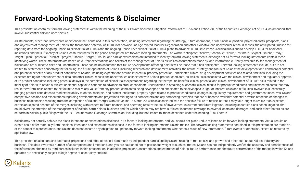 Forward-Looking Statements & Disclaimer This presentation contains “forward-looking statements” within the meaning of the U.S. Private Securities Litigation Reform Act of 1995 and Section 21E of the Securities Exchange Act of 1934, as amended, that involve substantial risk and uncertainties. All statements, other than statements of historical fact, contained in this presentation, including statements regarding the strategy, future operations, future financial position, projected costs, prospects, plans and objectives of management of Kalaris, the therapeutic potential of TH103 for neovascular Age-related Macular Degeneration and other exudative and neovascular retinal diseases, the anticipated timeline for reporting data from the ongoing Phase 1a clinical trial of TH103 and the ongoing Phase 1b/2 clinical trial of TH103, plans to advance TH103 into Phase 3 clinical trials and to develop TH103 for additional indications and the sufficiency of Kalaris’ cash resources for the period anticipated, are forward-looking statements. The words “anticipate,” “believe,” “continue,” “could,” “estimate,” “expect,” “intend,” “may,” “might,” “plan,” “potential,” “predict,” “project,” “should,” “target,” “would” and similar expressions are intended to identify forward-looking statements, although not all forward-looking statements contain these identifying words. These statements are based on current expectations and beliefs of the management of Kalaris as well as assumptions made by, and information currently available to, the management of Kalaris and are subject to risks and uncertainties. There can be no assurance that future developments affecting Kalaris will be those that it has anticipated. Forward-looking statements include, but are not limited to, statements concerning the following: the future operations of Kalaris, including research and development activities; the nature, strategy and focus of Kalaris; the development and commercial potential and potential benefits of any product candidate of Kalaris, including expectations around intellectual property protection; anticipated clinical drug development activities and related timelines, including the expected timing for announcement of data and other clinical results; the uncertainties associated with Kalaris’ product candidate, as well as risks associated with the clinical development and regulatory approval of its product candidate, including potential delays in the completion of clinical trials; expectations regarding the therapeutic benefits, clinical potential and clinical development of TH103; risks related to the inability of Kalaris to obtain sufficient additional capital to continue to advance its product candidate; uncertainties in obtaining successful clinical results for product candidates and unexpected costs that may result therefrom; risks related to the failure to realize any value from any product candidates being developed and anticipated to be developed in light of inherent risks and difficulties involved in successfully bringing product candidates to market; the ability to obtain, maintain, and protect intellectual property rights related to product candidates; changes in regulatory requirements and government incentives; Kalaris’ competitive position and expectations regarding developments and projections relating to its competitors and any competing therapies that are or become available; potential adverse reactions or changes to business relationships resulting from the completion of Kalaris’ merger with AlloVir, Inc. in March 2025; risks associated with the possible failure to realize, or that it may take longer to realize than expected, certain anticipated benefits of the merger, including with respect to future financial and operating results; the risk of involvement in current and future litigation, including securities class action litigation, that could divert the attention of the management of Kalaris, harm Kalaris’ business and for which Kalaris may not have sufficient insurance coverage to cover all costs and damages; and such other factors as are set forth in Kalaris’ public filings with the U.S. Securities and Exchange Commission, including, but not limited to, those described under the heading “Risk Factors”. Kalaris may not actually achieve the plans, intentions or expectations disclosed in its forward-looking statements, and you should not place undue reliance on its forward-looking statements. Actual results or events could differ materially from the plans, intentions and expectations disclosed in the forward-looking statements Kalaris makes. The forward-looking statements contained in this presentation are made as of the date of this presentation, and Kalaris does not assume any obligation to update any forward-looking statements, whether as a result of new information, future events or otherwise, except as required by applicable law. This presentation also contains estimates, projections and other statistical data made by independent parties and by Kalaris relating to market size and growth and other data about Kalaris’ industry and business. This data involves a number of assumptions and limitations, and you are cautioned not to give undue weight to such estimates. Kalaris has not independently verified the accuracy and completeness of the information obtained by third parties included in this presentation. In addition, projections, assumptions and estimates of Kalaris’ future performance and the future performance of the market in which Kalaris operates are necessarily subject to high degree of uncertainty and risk. 2
